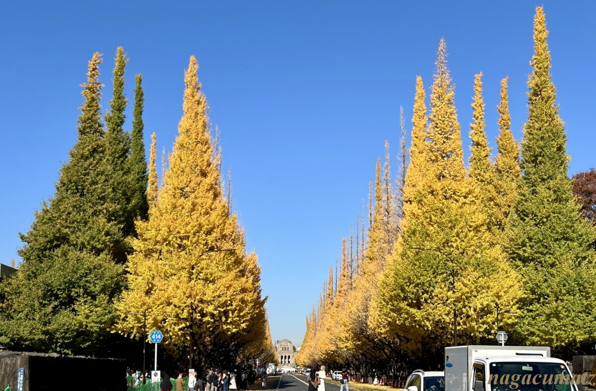 今まで週末であっても、ライトアップ時刻までは車の通行が出来たので、車窓からゆっくり(渋滞のお陰で😂)見られたのだが、今年からは週末はお昼間でも通行止めとなっていたので、今年は絵画館前から青山通り方面を眺めることに(11月24日撮影)