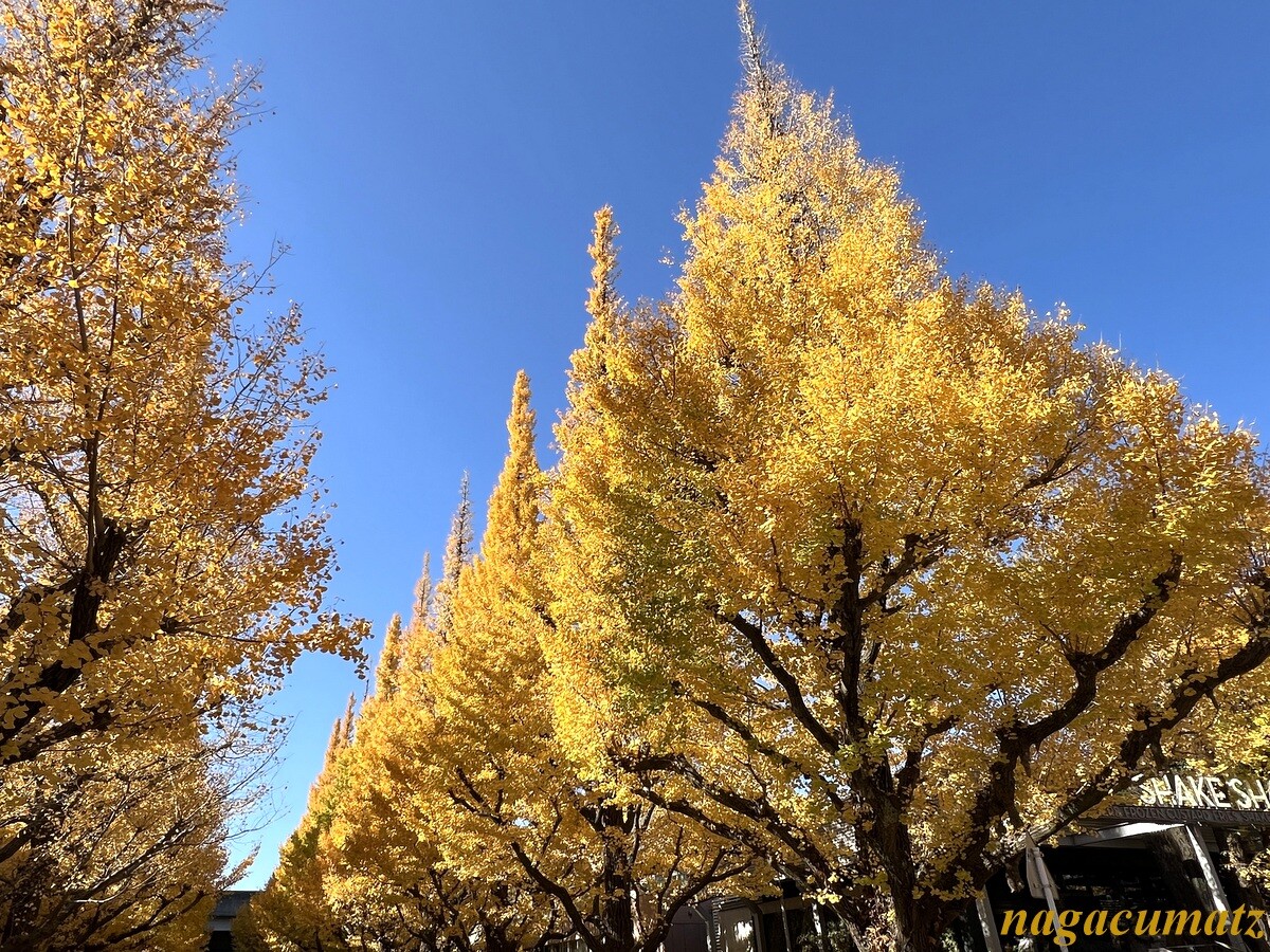 パーキング入口に少しあるイチョウ並木は、従来のイチョウ並木と90度異なる方向に植わっており、南を向いていることから、なかなか綺麗だった。
