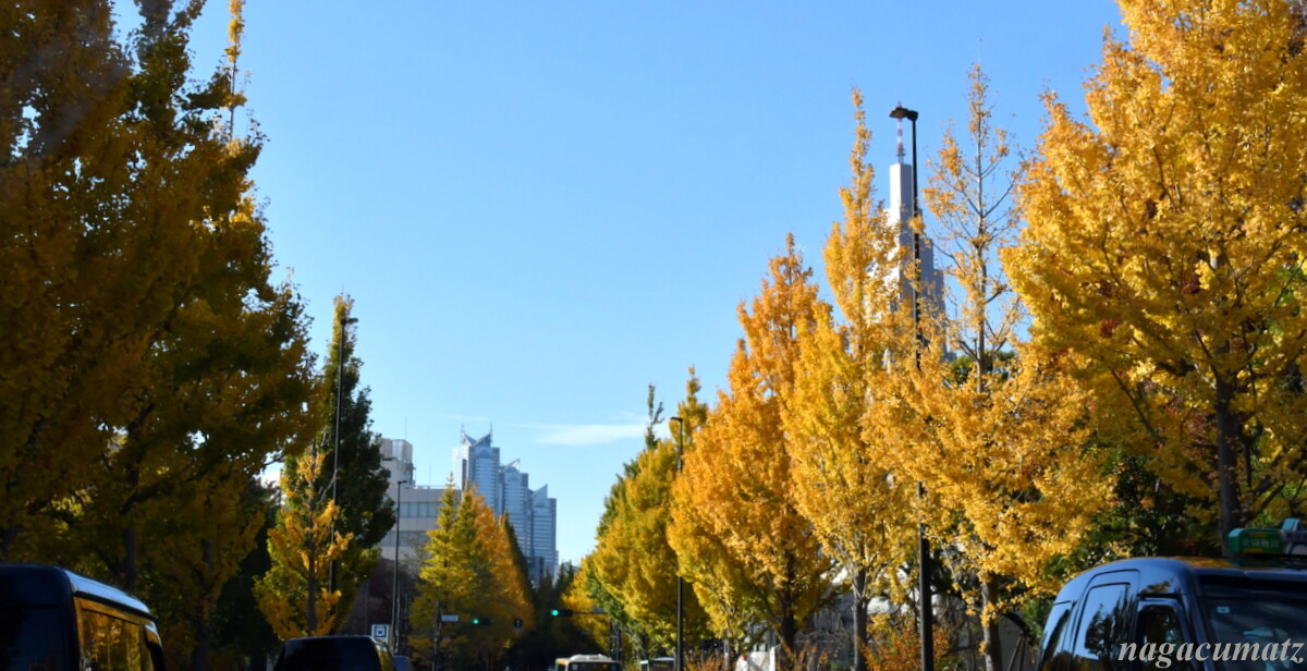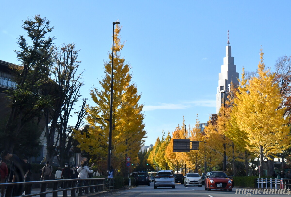 11月24日は車だったので、絵画館前から千駄ヶ谷方面に抜けたのだが、そちらのイチョウ並木も捨てがたい!右にドコモタワー、左に国立競技場。