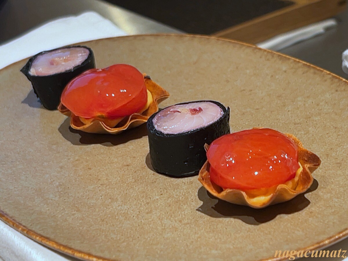 トマトのタルト、鯖と茗荷を竹炭の生地で巻いたものを。