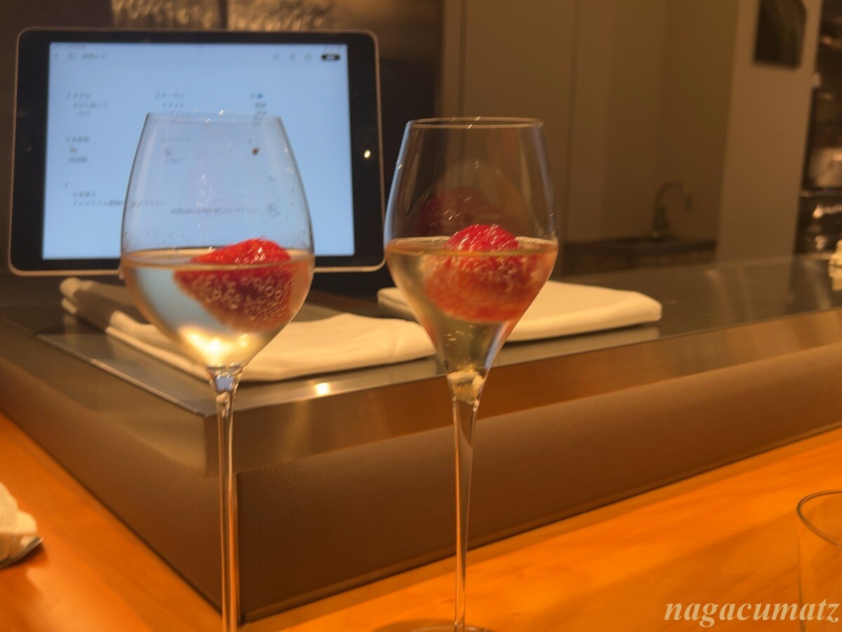 食前酒として、ノンアルコールスパークリングには冷凍されたイチゴが入っている。