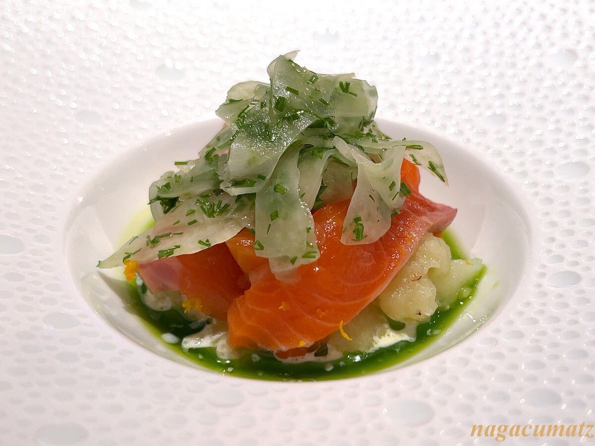 ポテトの上にサーモン、そしてウイキョウ(フヌイユ)、ソースはピストゥー(プロヴァンス地方発祥のバジルペースト)。