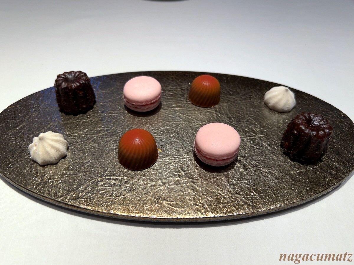 アールグレイのギモーヴ、塩キャラメルのチョコレート、フランボワーズのマカロン、カヌレ