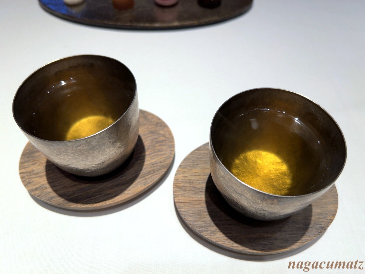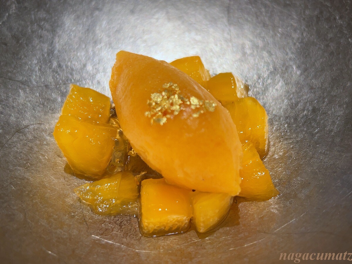 柿のソルベや柿のコンポート、コニャックのジュレが付いている。デザートのカトラリーには、シェフご出身の新潟の黒檀、紫檀のもの、漆器の食器などが使われている。