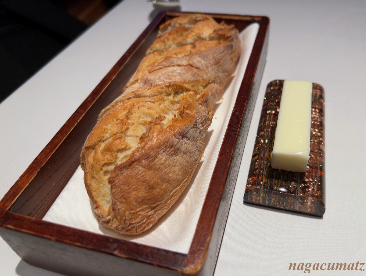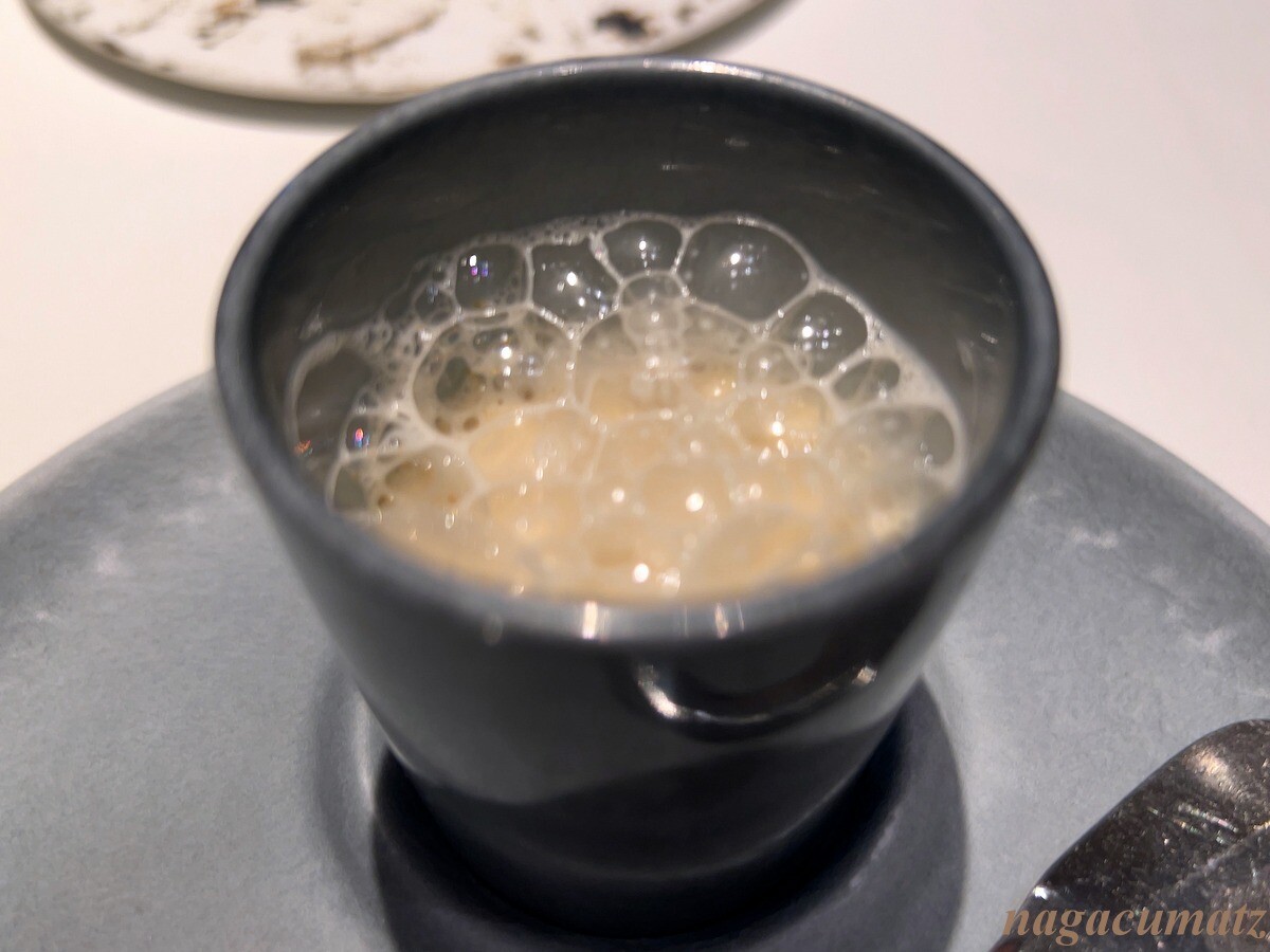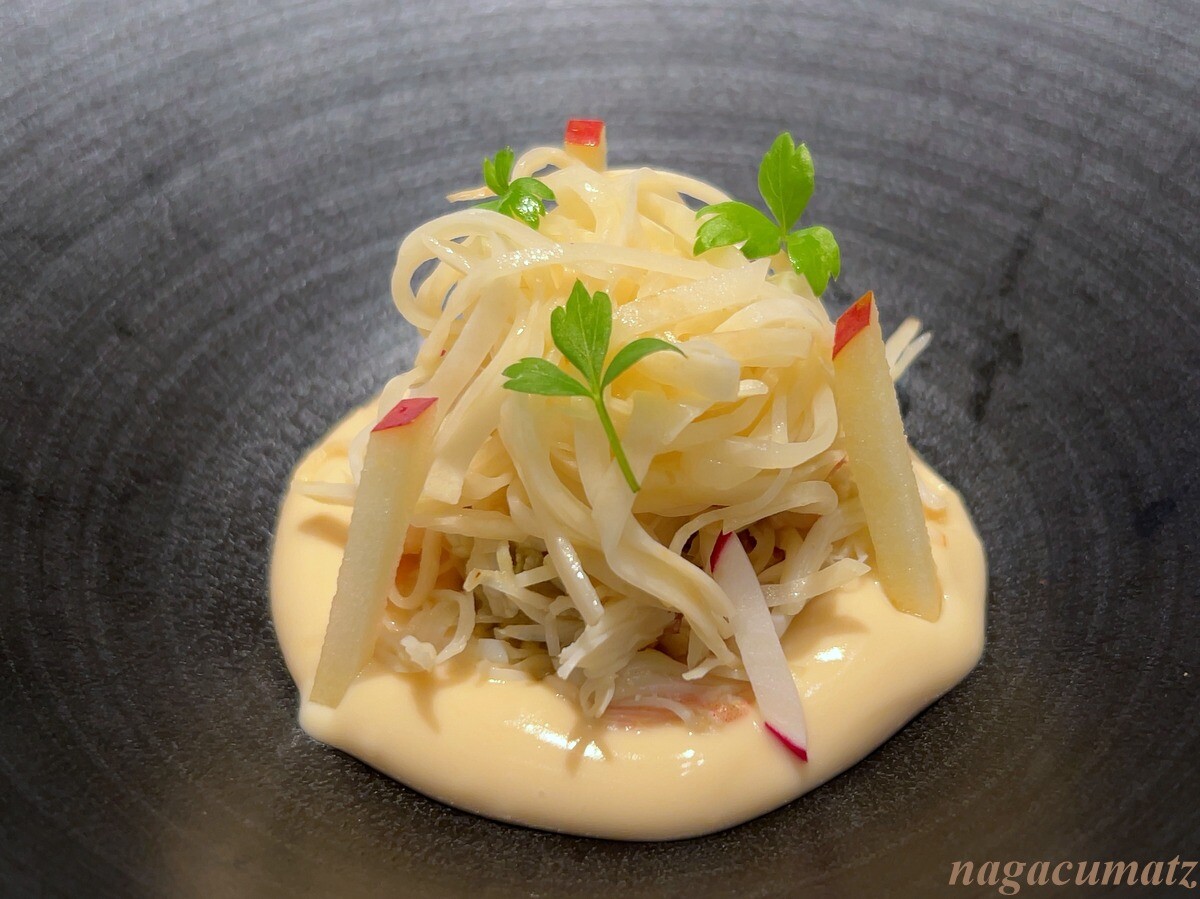 このパンの形は?! ルクセンブルグからの輸入品。やはり。ジョンティ・アッシュ や ラリューム でも出されたパンなので、お聞きしてみると、シェフ達は皆さんロブション出身で、特にラリュームのシェフとは先輩・後輩の間柄とのこと。セロリアークとズワイガニ リンゴが少し加えられている。