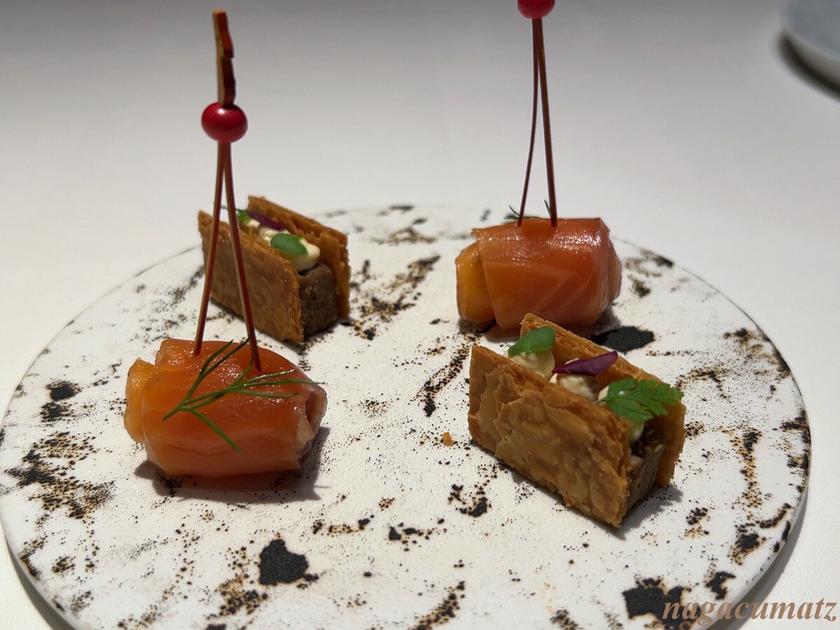 パイ生地の間には、カルボナードとマスタードクリーム、タスマニアサーモンのオリーブ巻