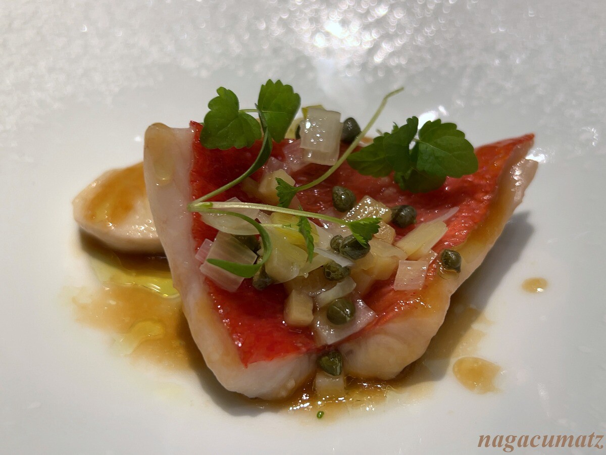 金目鯛 後ろには里芋、上にはパクチー、生姜、レモンバームのスプラウトが載り、魚醤のソースがかかる。