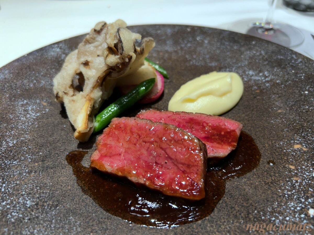別海町の和牛のイチボには、舞茸など能登の野菜が使われている。和牛はちょっと硬い💦