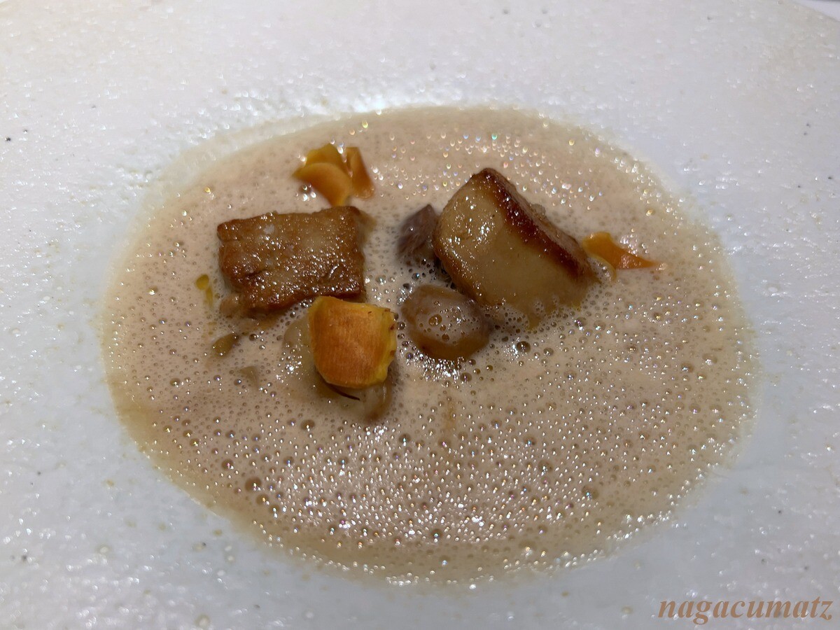 栗のスープには、フォワグラ、マロングラッセ、栗のチップが入っていて美味しい。
