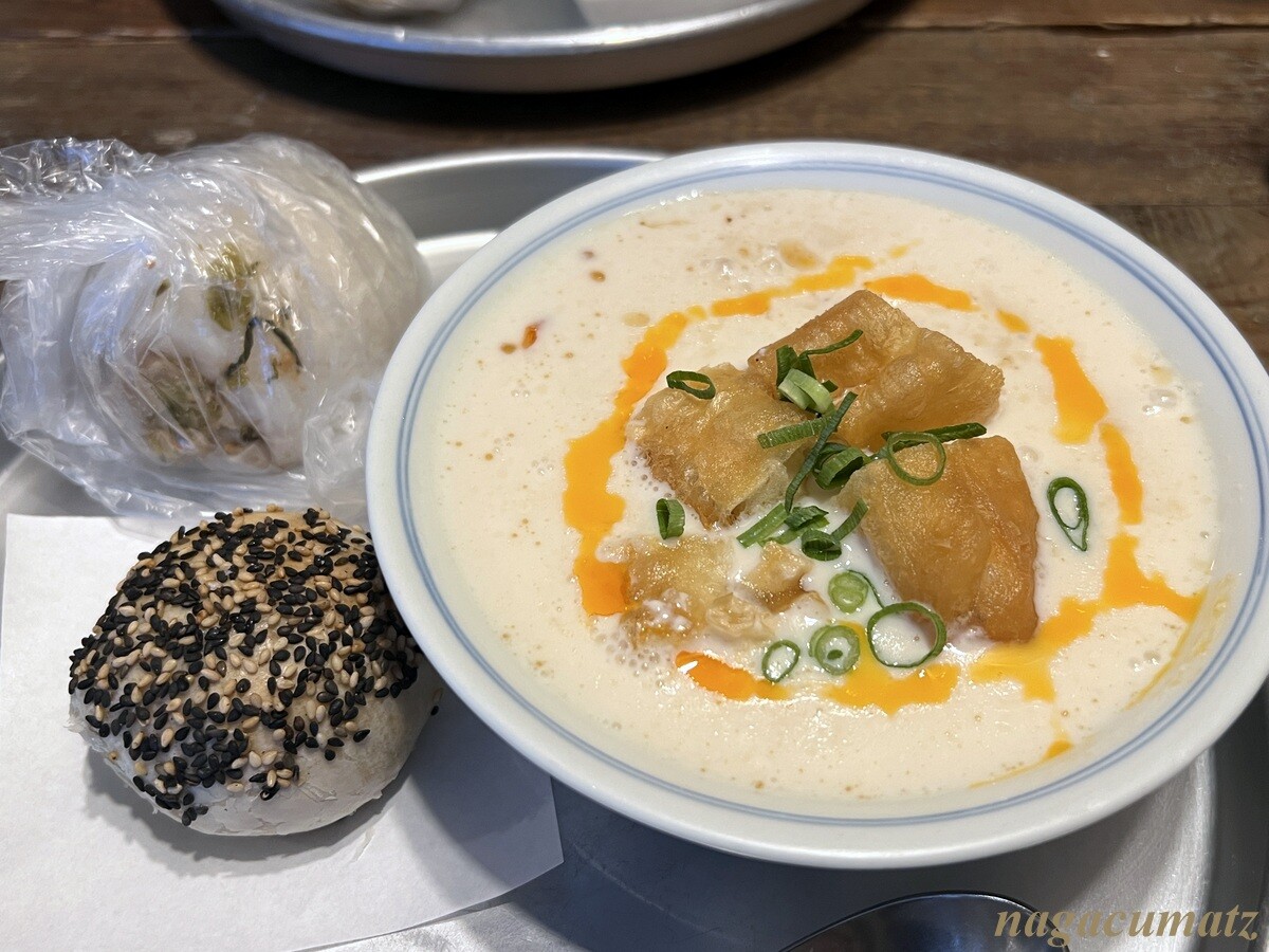 鹹は塩味、豆漿は豆乳スープのこと。上には揚げパンの油條(よーてぃやお)が載り、ラー油がかけられていて、スープの底まで混ぜると酸味もあり、美味しい。