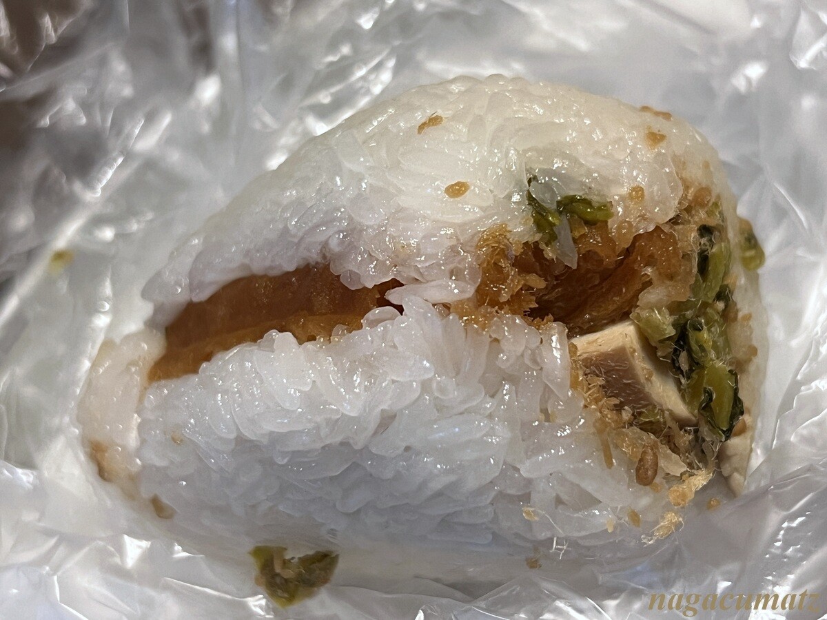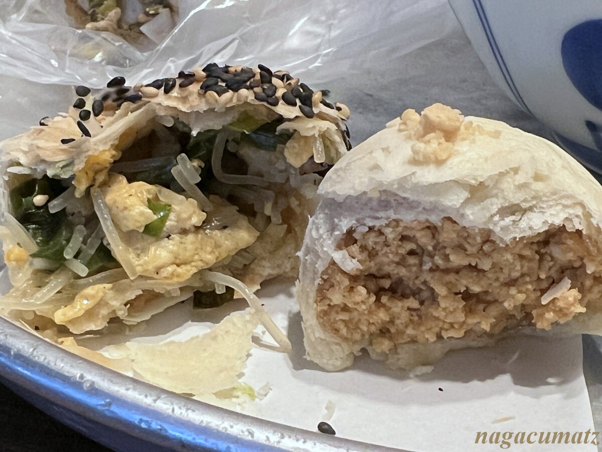 糯米のおにぎりには、八角などの香りがしっかりついた煮卵、揚げパンの油條、高菜、干し大根、ピーナッツ、肉でんぶがぎっしりと入っていて、複雑なお味や異なる食感など、楽しめて非常に美味しい。