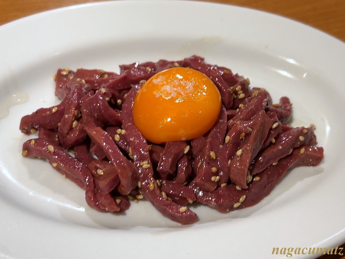 上ハツ塩ユッケ 1045円 ハツのユッケは初めていただいた。