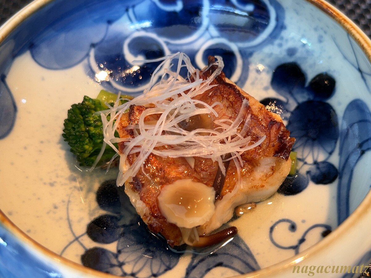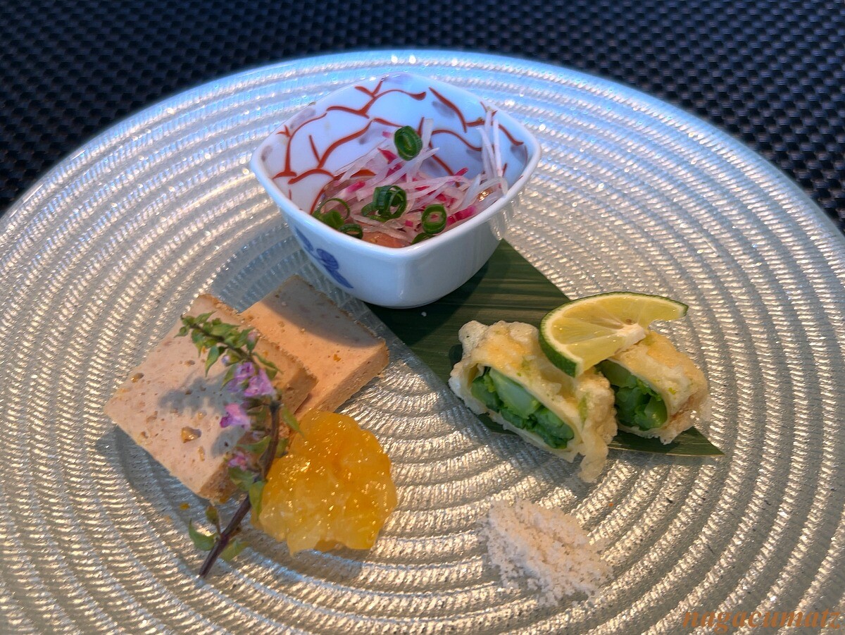 寒ブリ、菜の花の磯辺揚げには柚子塩、鶏肉の松風焼きには柚子ジャムが付く。