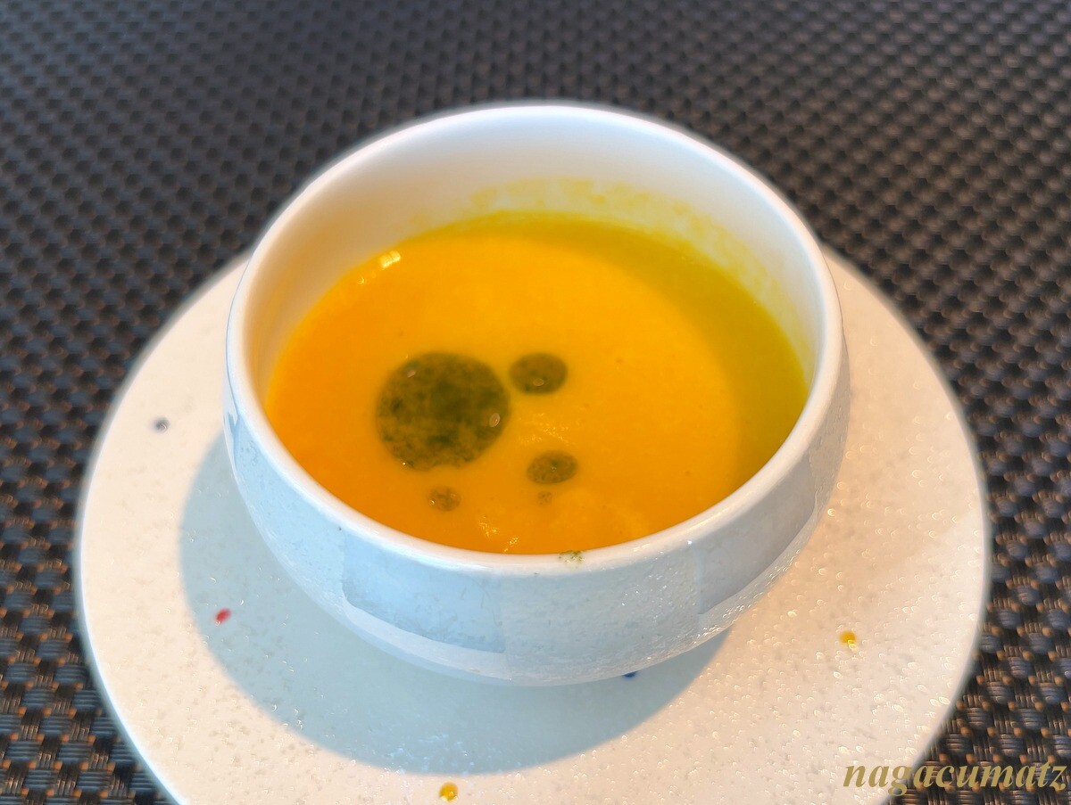 南瓜と蕪のスープには、バジルオイルが。