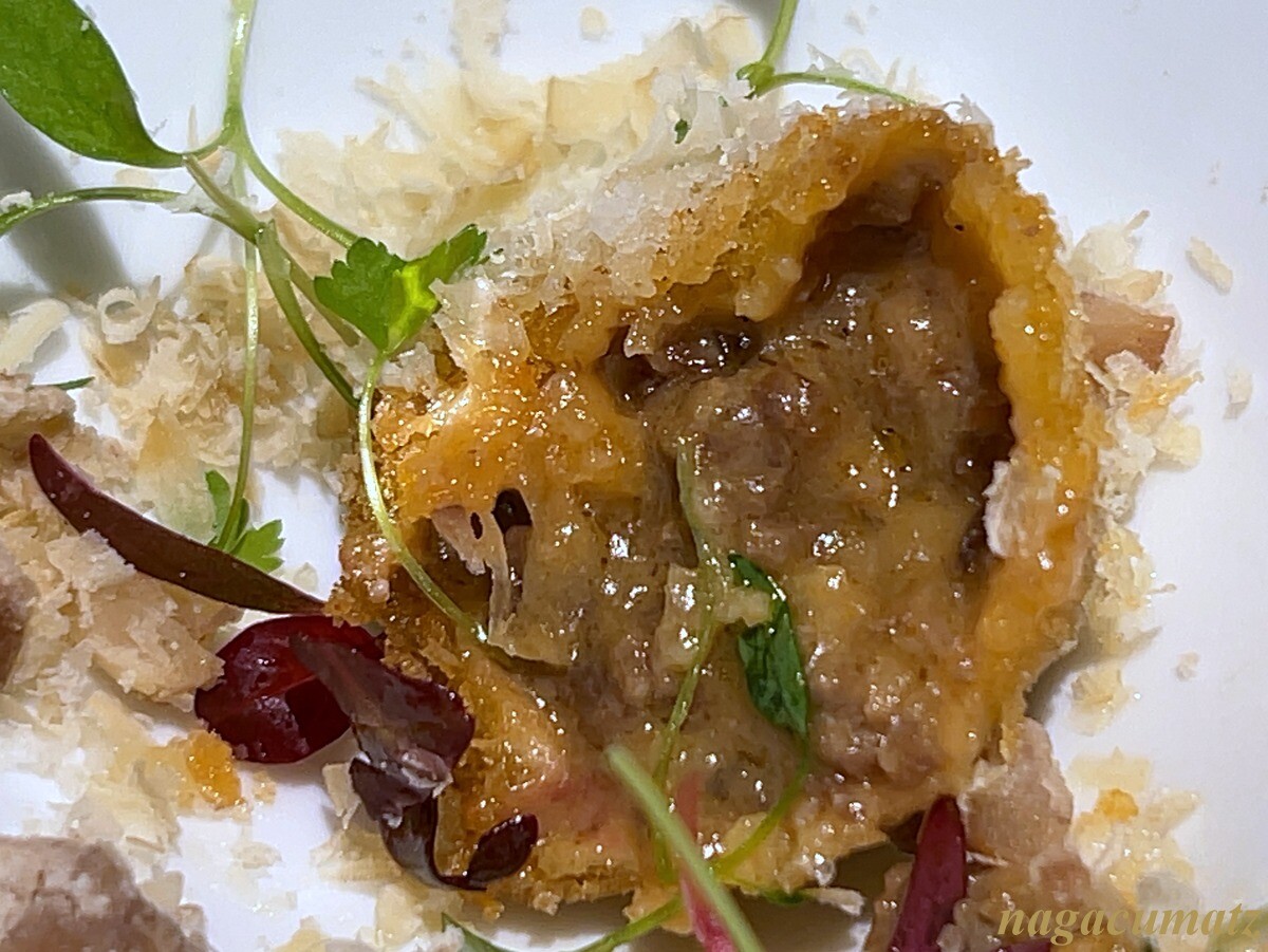 猪とペリゴール産栗のクロケッティーナ 中がとても柔らかく、削った栗がかかっている。