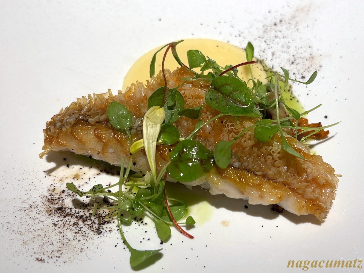 甘鯛はいわゆる松笠焼きとなっていてパリパリで、艶めかしい火の入れ方が美味しい。きのこはジロール茸。