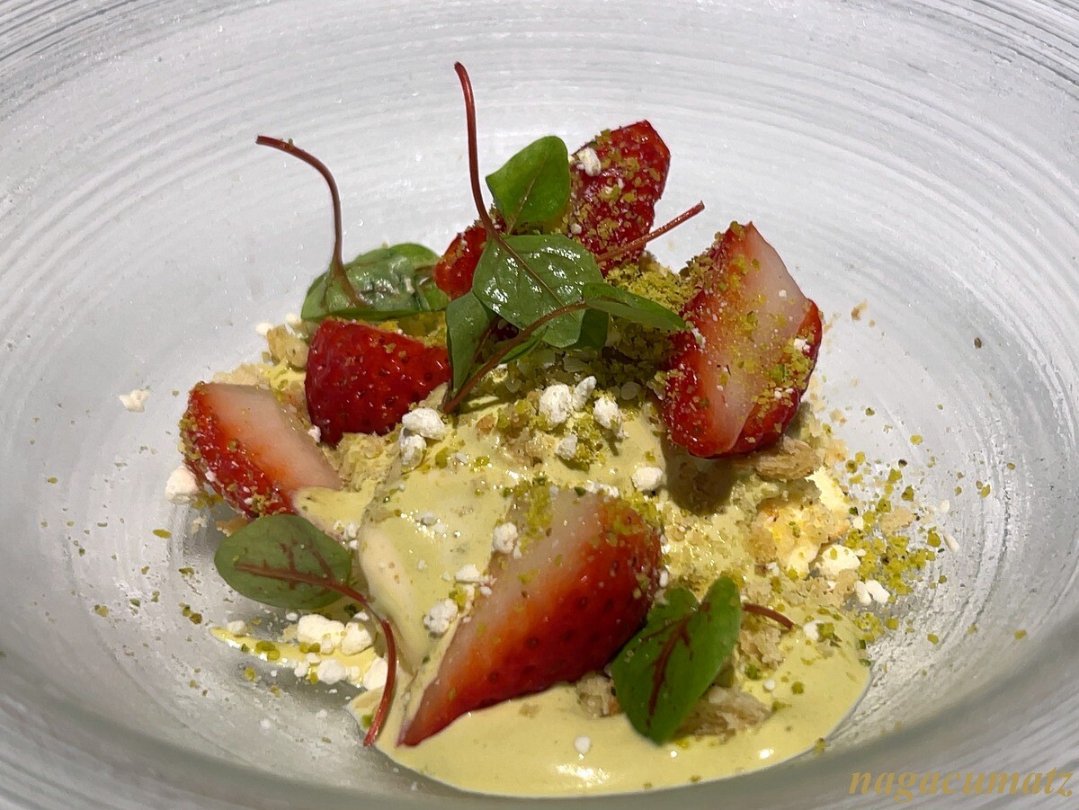 苺はキルシュでマリネされており、下にホワイトチョコレートのムースが敷かれている。ピスタチオのクリームが美味しい。