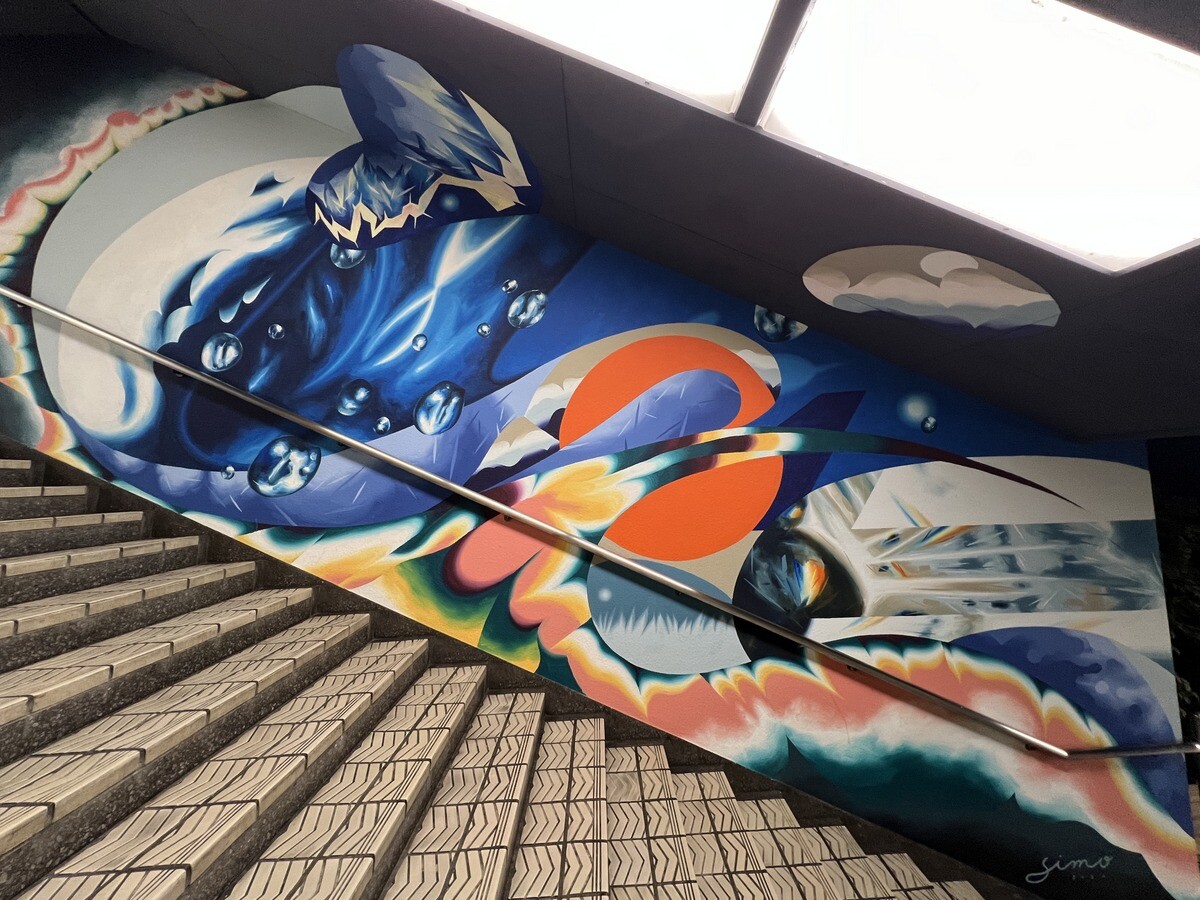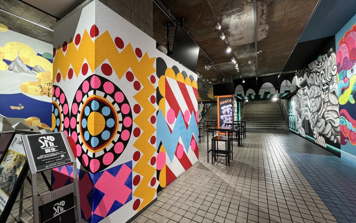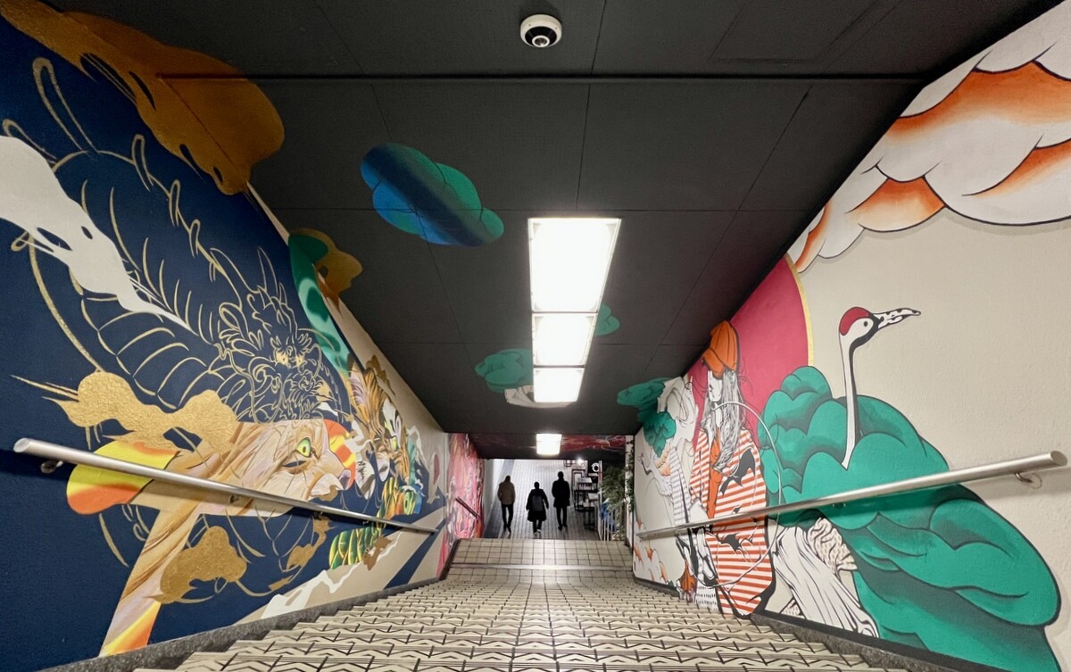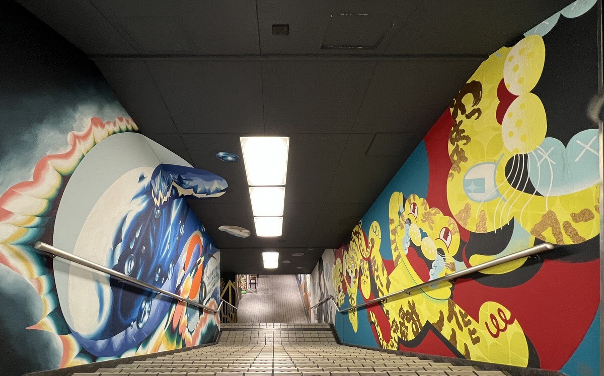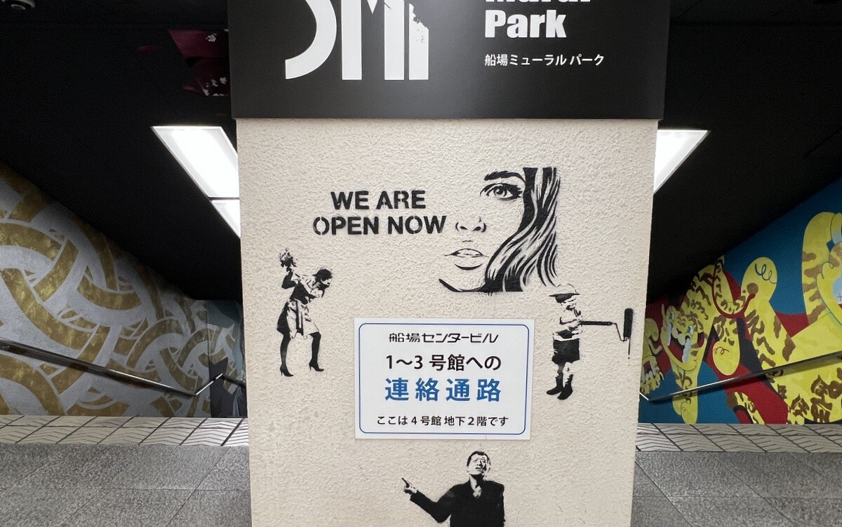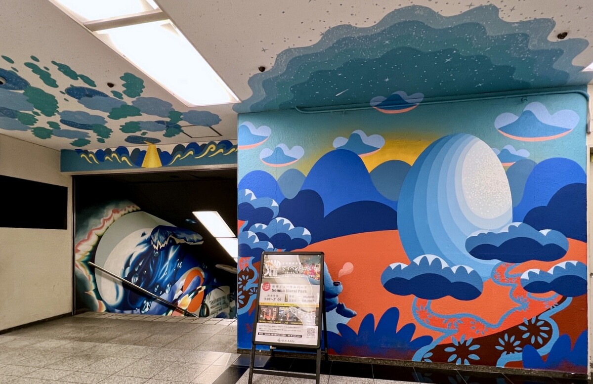 1970年開催の大阪万博に合わせて建造された船場センタービルは、東西1,000mにわたる大型商業施設。2020年に、開館50周年記念として、船場センタービル3・4号 館地下2階連絡通路内が「船場アートミューラルパーク」となった。総勢24名のアーティストが参加していて見応えがあり、屋外のミューラルアートと異なり屋内なので、色が鮮やか。
