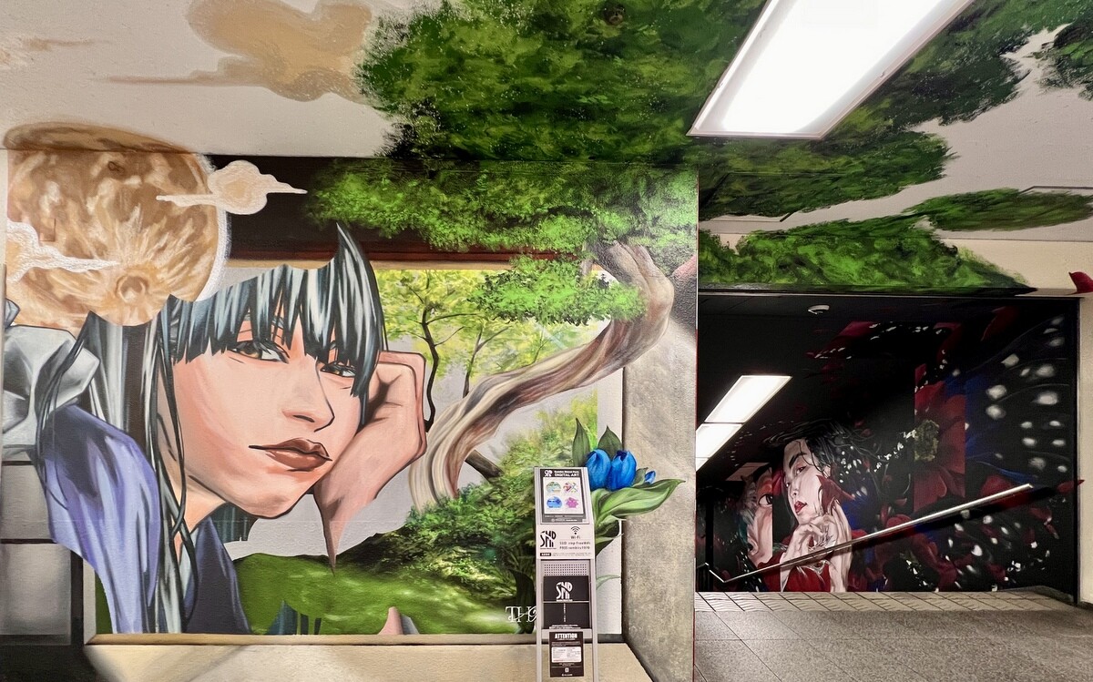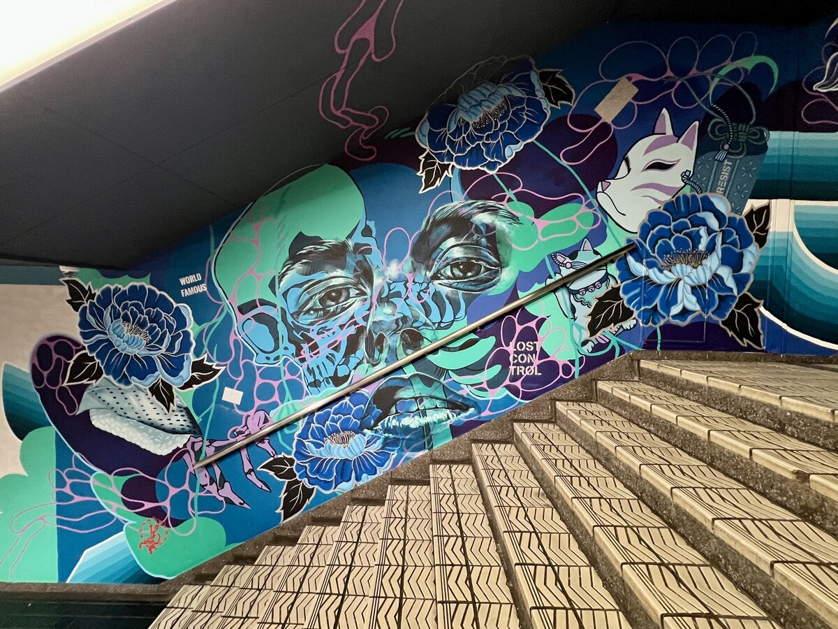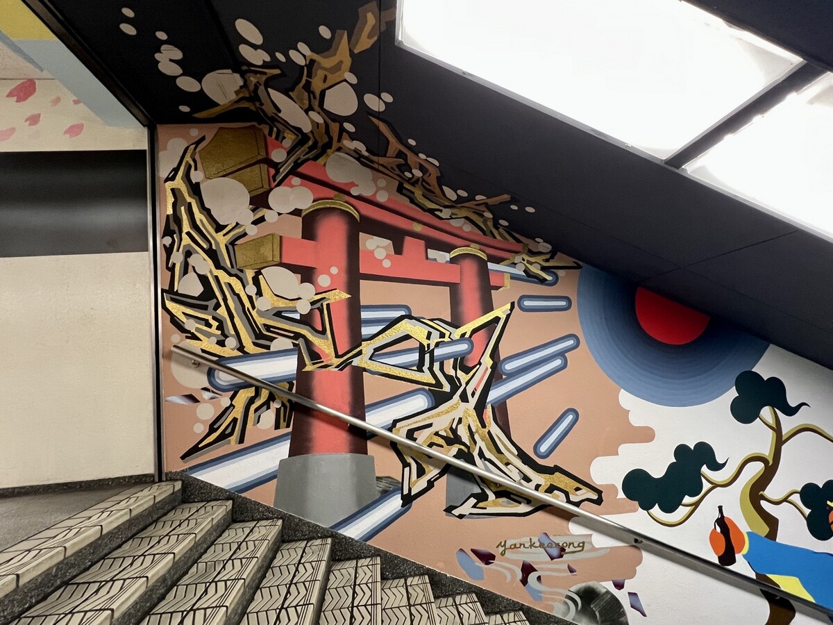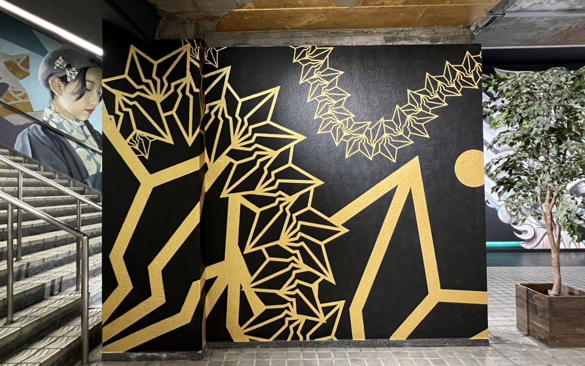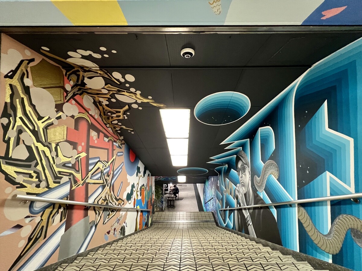 1970年開催の大阪万博に合わせて建造された船場センタービルは、東西1,000mにわたる大型商業施設。2020年に、開館50周年記念として、船場センタービル3・4号 館地下2階連絡通路内が「船場アートミューラルパーク」となった。総勢24名のアーティストが参加していて見応えがあり、屋外のミューラルアートと異なり屋内なので、色が鮮やか。