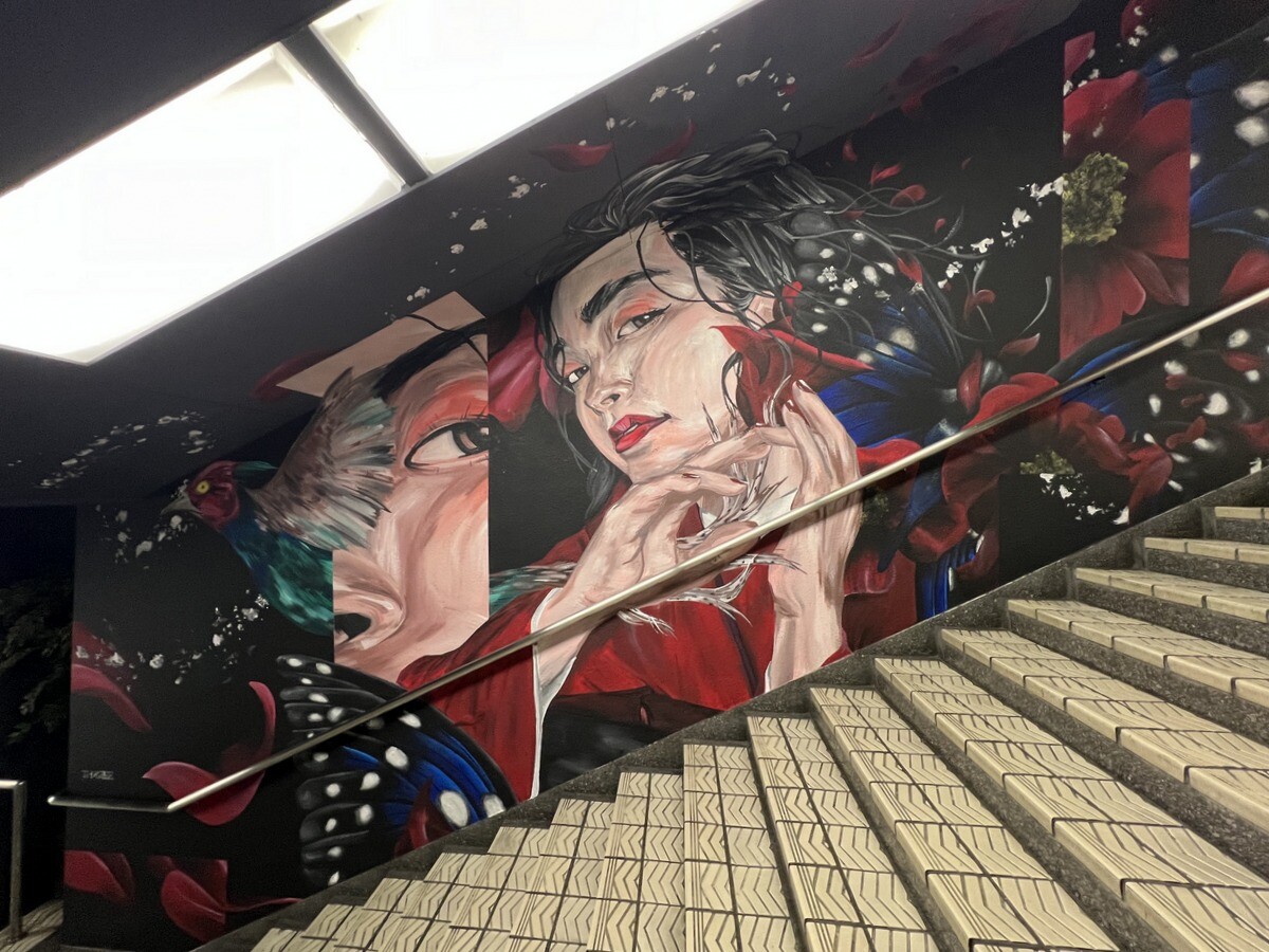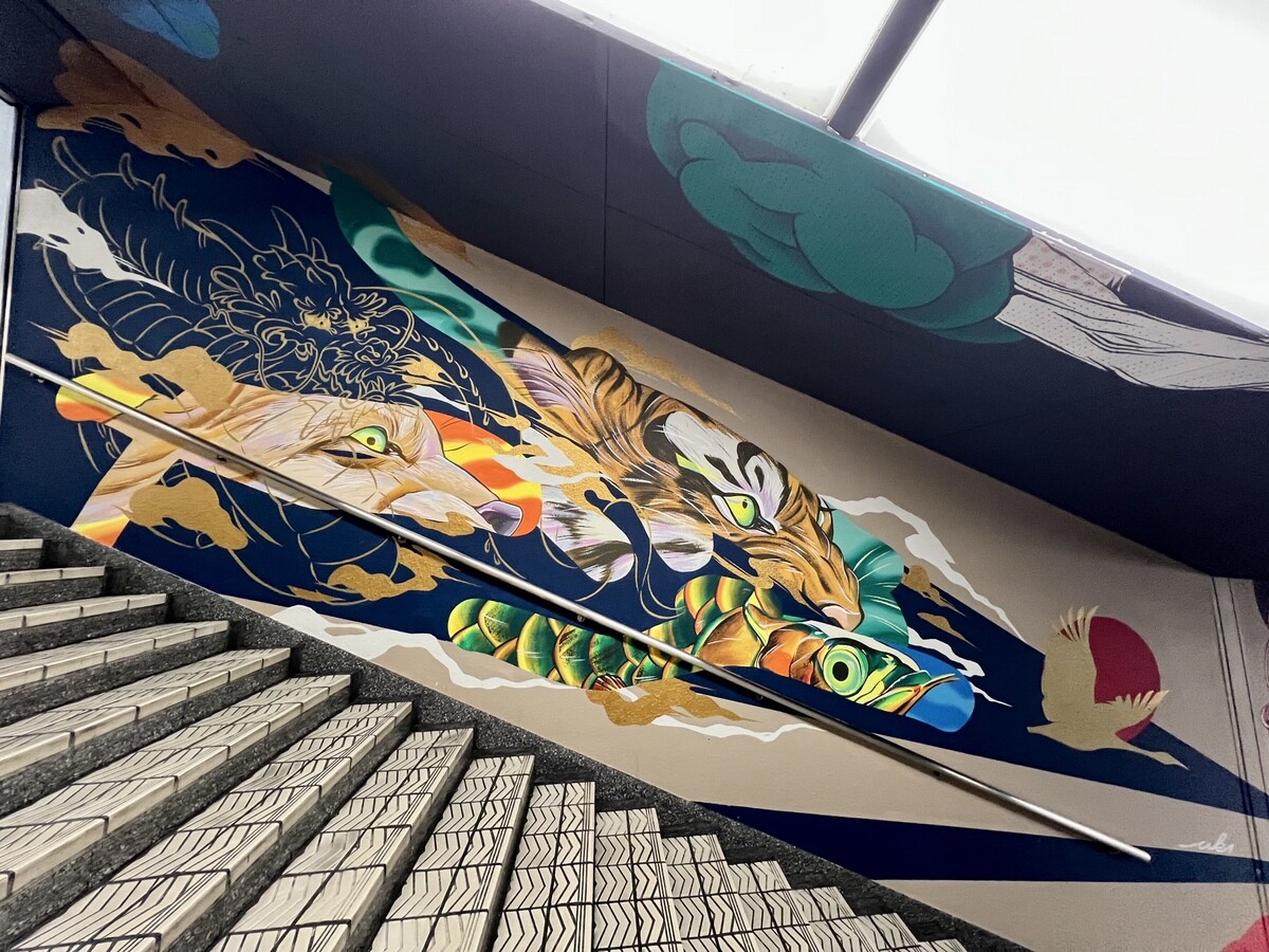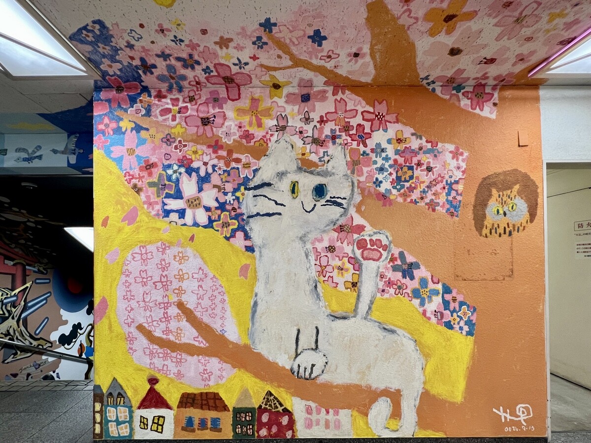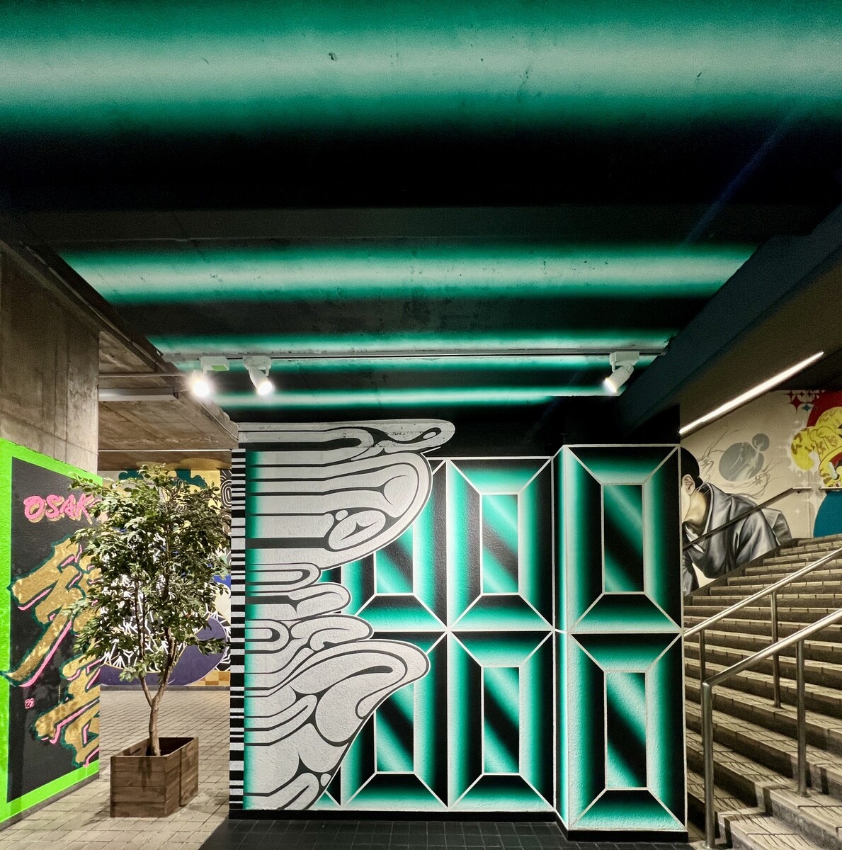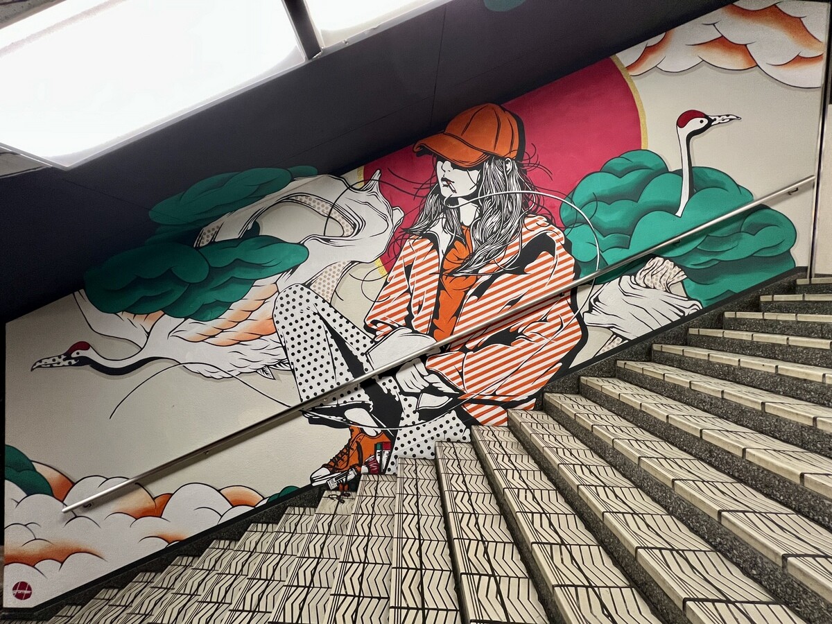 1970年開催の大阪万博に合わせて建造された船場センタービルは、東西1,000mにわたる大型商業施設。2020年に、開館50周年記念として、船場センタービル3・4号 館地下2階連絡通路内が「船場アートミューラルパーク」となった。総勢24名のアーティストが参加していて見応えがあり、屋外のミューラルアートと異なり屋内なので、色が鮮やか。
