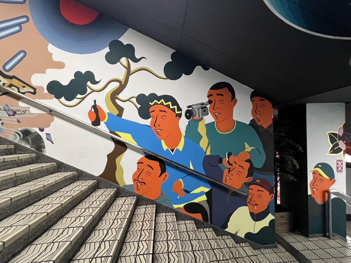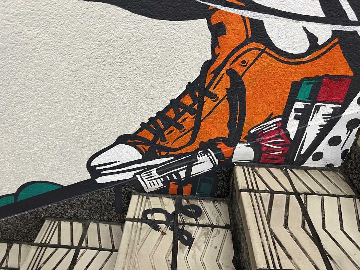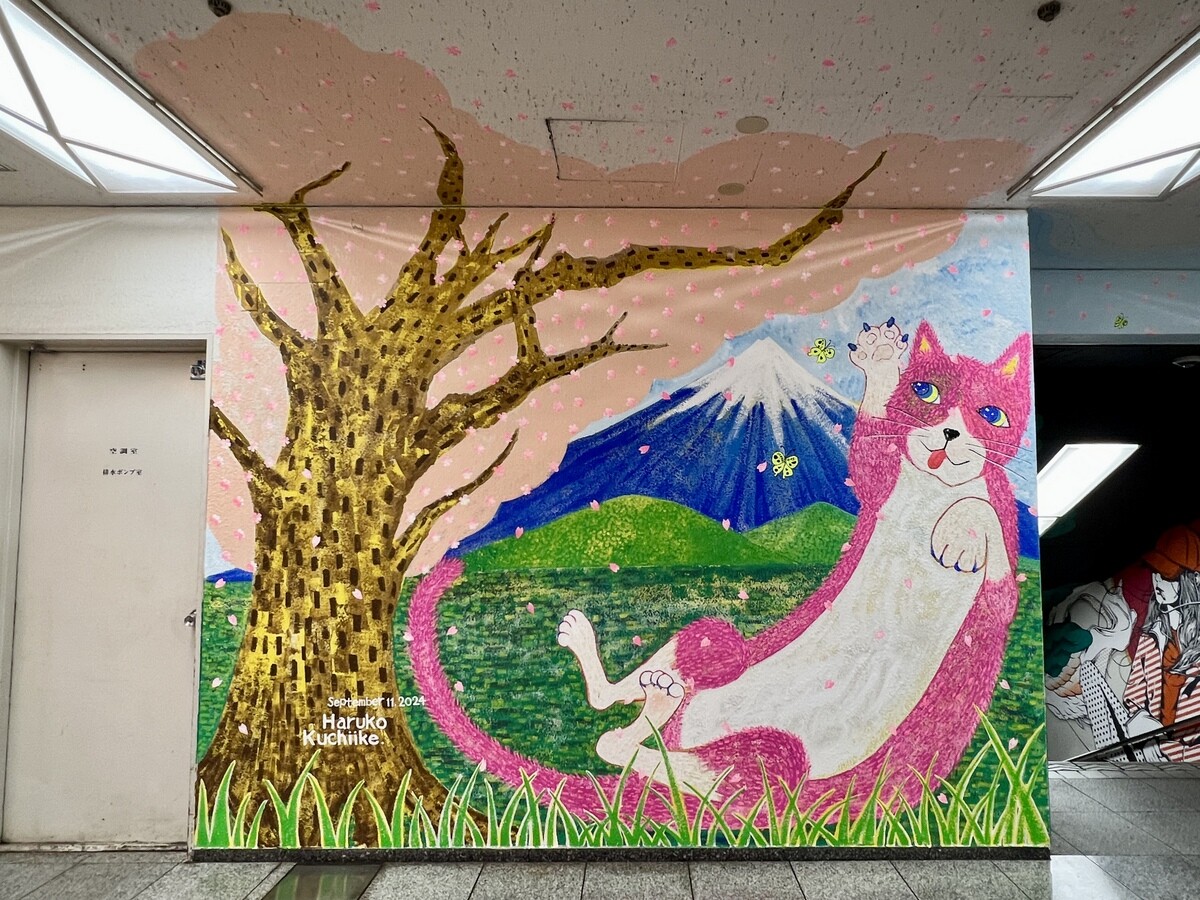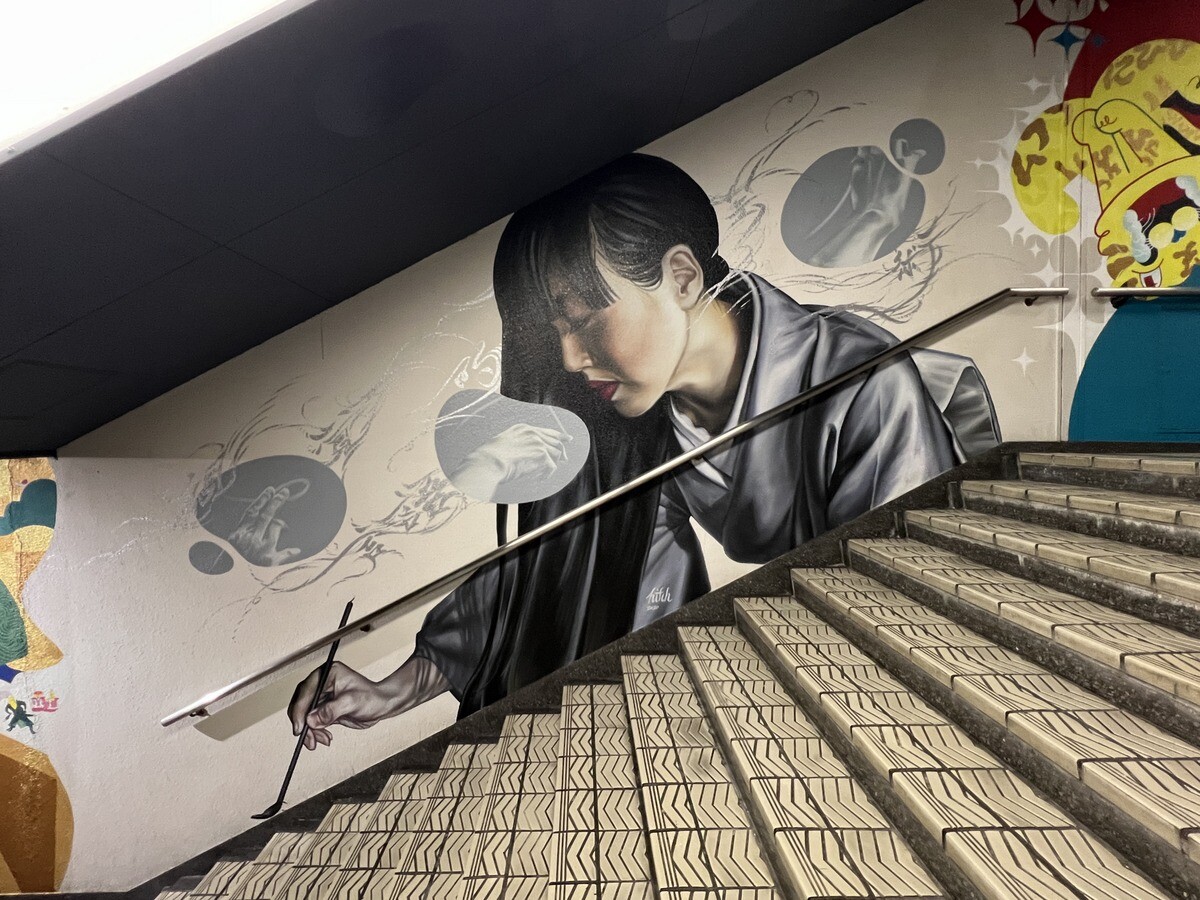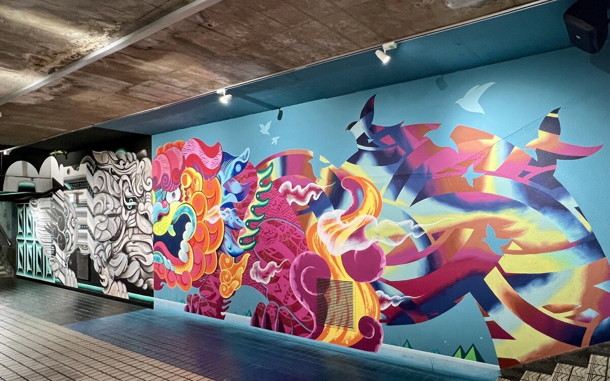 1970年開催の大阪万博に合わせて建造された船場センタービルは、東西1,000mにわたる大型商業施設。2020年に、開館50周年記念として、船場センタービル3・4号 館地下2階連絡通路内が「船場アートミューラルパーク」となった。総勢24名のアーティストが参加していて見応えがあり、屋外のミューラルアートと異なり屋内なので、色が鮮やか。