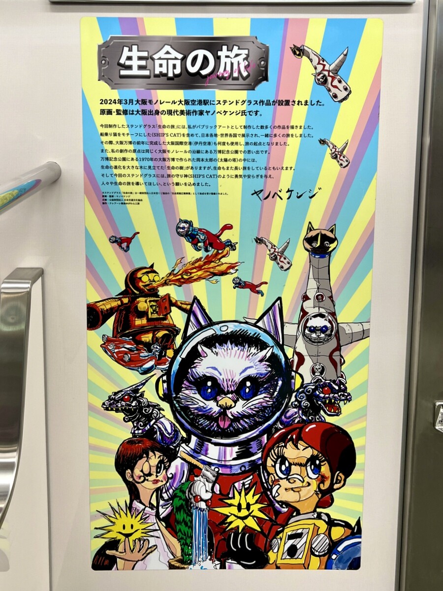 2026年01月30日 パブリックアート ヤノベケンジ @ 大阪モノレール 大阪モノレールの大阪空港駅にあるステンドグラスの《生命の旅》のデザインをラッピングした「生命の旅号」に乗り合わせることができた。ステンドグラスの様子は: 守り神や守護獣など8組が描かれているのだが、ホームドアが設置されているので、ちゃんと見えないのが非常に残念💦 2015年3月から運行開始し、約5年間運行予定とのこと。にほんブログ村にほんブログ村 「アート鑑賞」カテゴリの最新記事 < 前の記事次の記事 > コメント コメントフォーム 名前 コメント 記事の評価 リセット リセット 顔 星 情報を記憶 コメントを投稿する