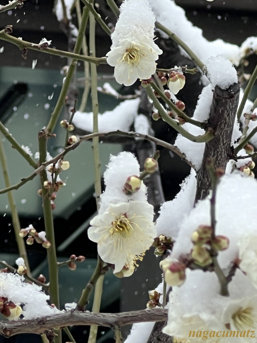 梅林坂の梅にも雪がつもっていた。その様子は追って。