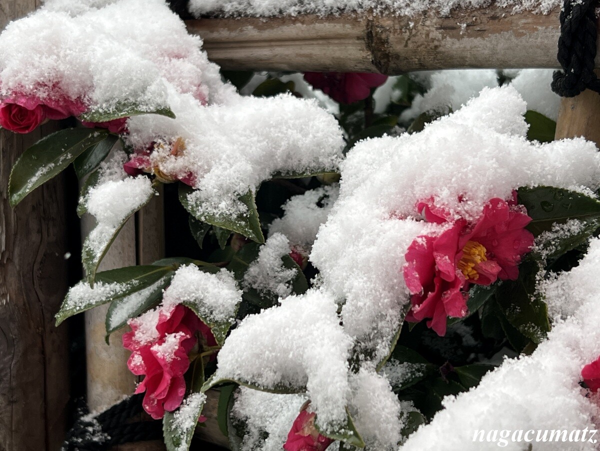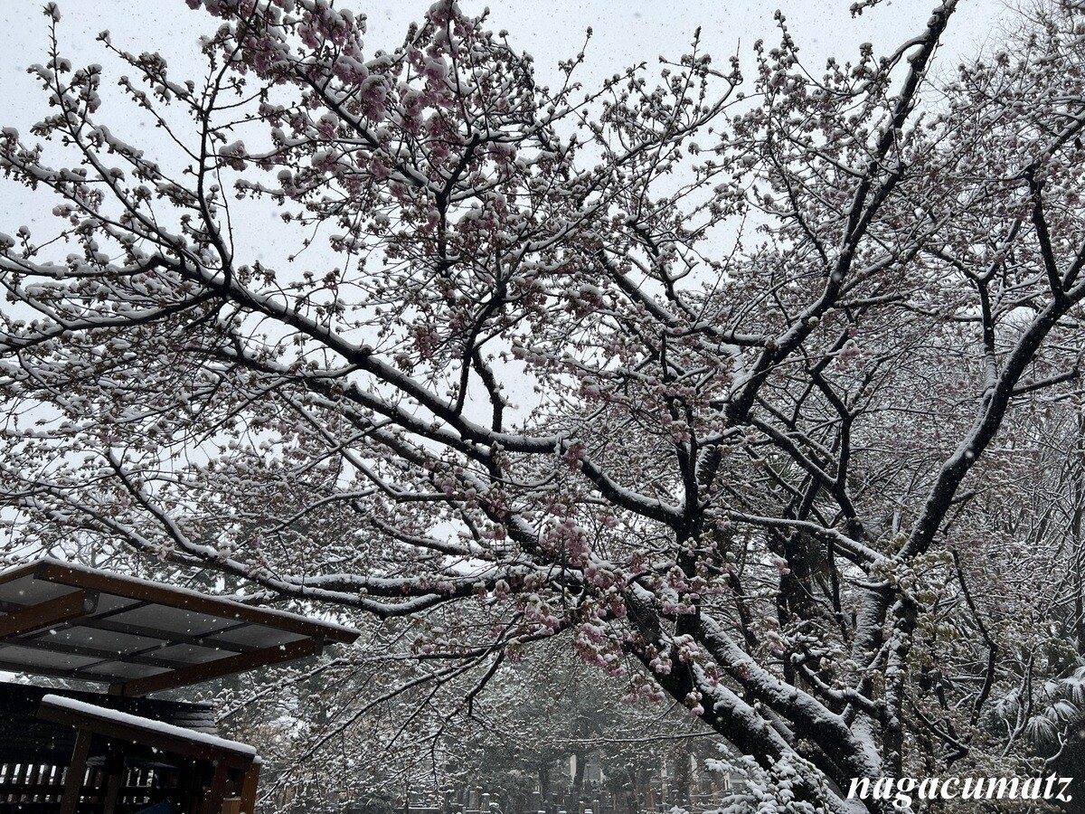 せっかく咲いていた近所のお寺の寒緋桜にも雪が積もっていた。