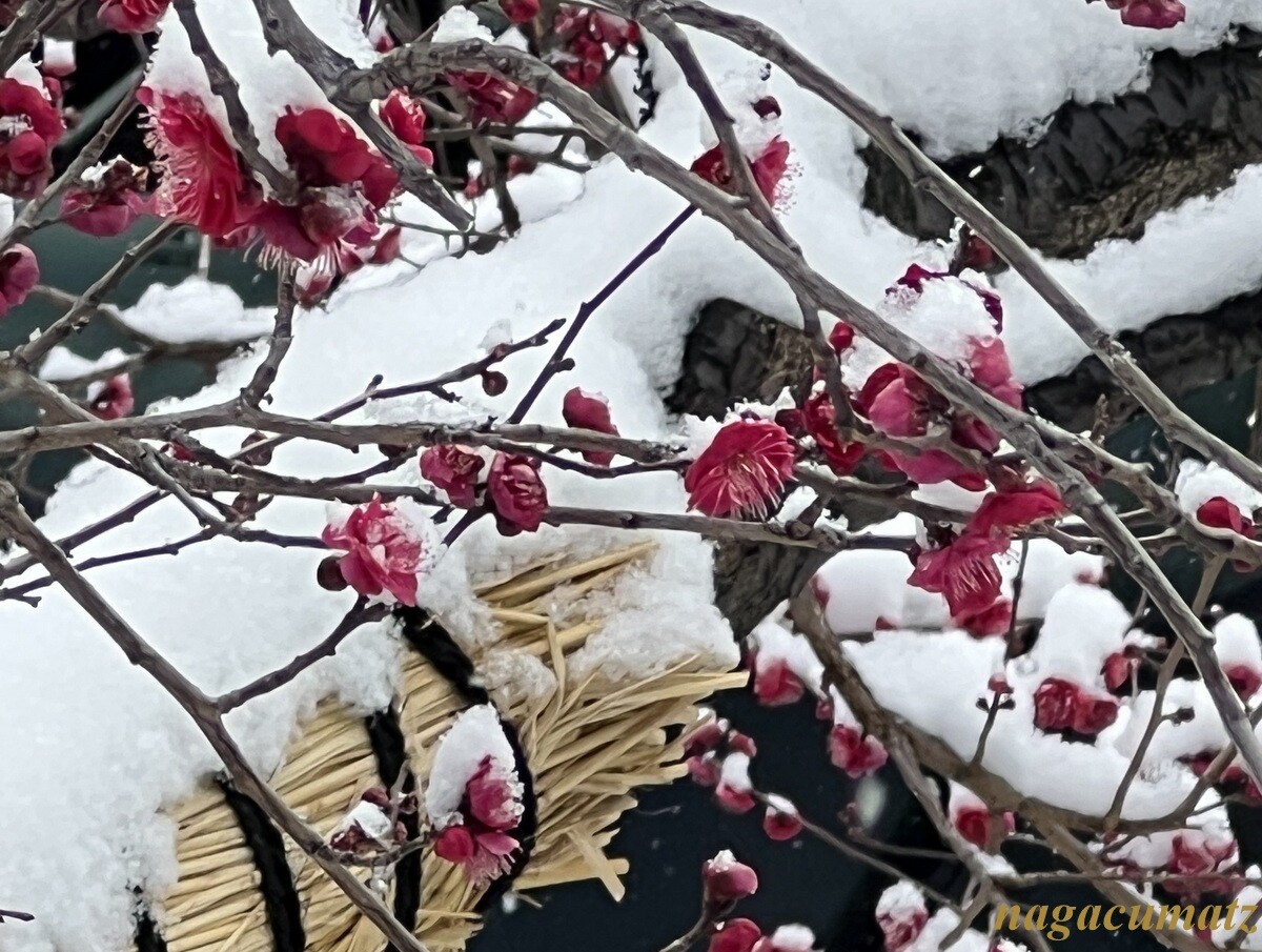 紅白の梅にも雪が。赤は鹿児島紅(かごしまこう)、白は白加賀。