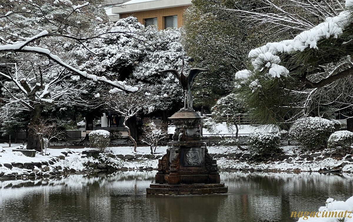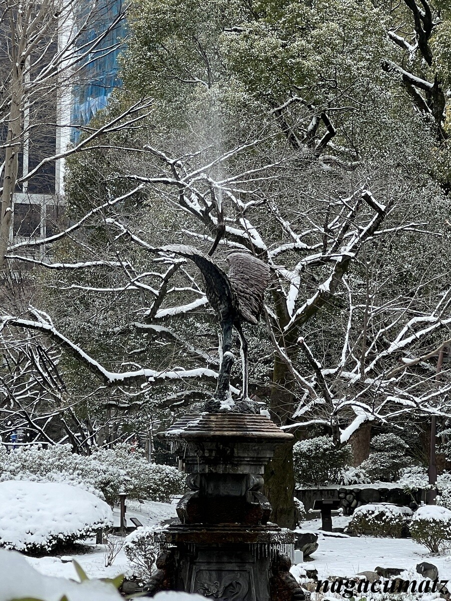 寒い時に必ず報道される、羽根のつららが名物の鶴の噴水は、午後だったので、台座につららが少しある程度💧