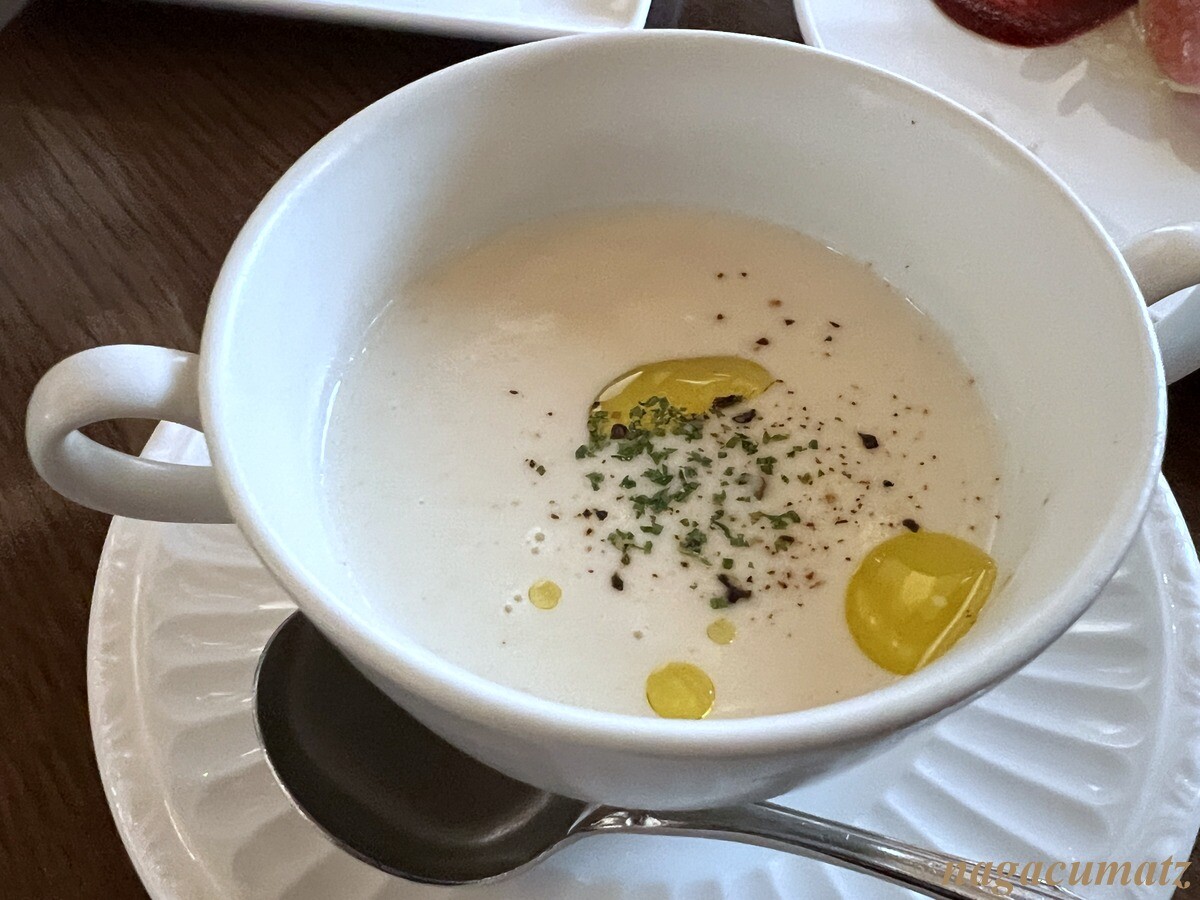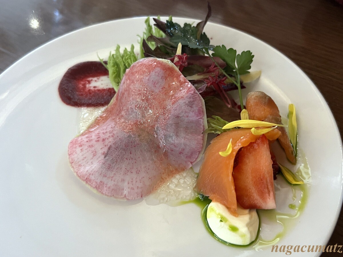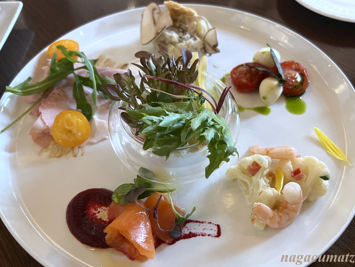 シーズンガーデンサラダ、ジャンボンブランと金柑のコンポートバルサミコソース、トリュフ風味のポテトのミルフィーユ仕立て、海老とカリフラワーのマリネ、スモークサーモンとビーツのピュレ、冷製ミディトマトのローストとモッツァレラとバジリコ
