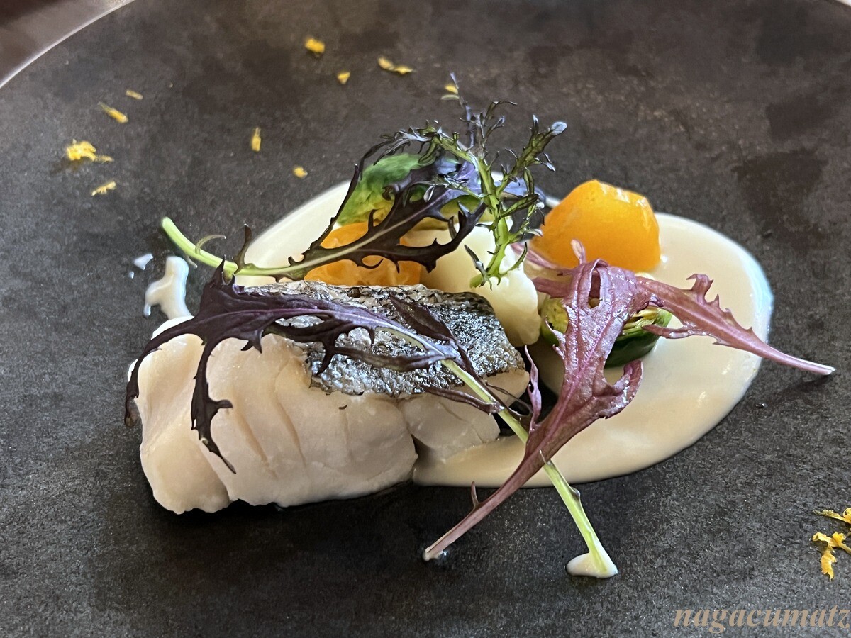 真鯛のブレゼ バーニャソース 2800円 冬野菜と金柑のコンフィチュールが添えられている。