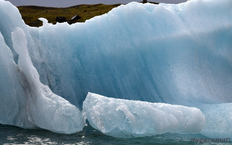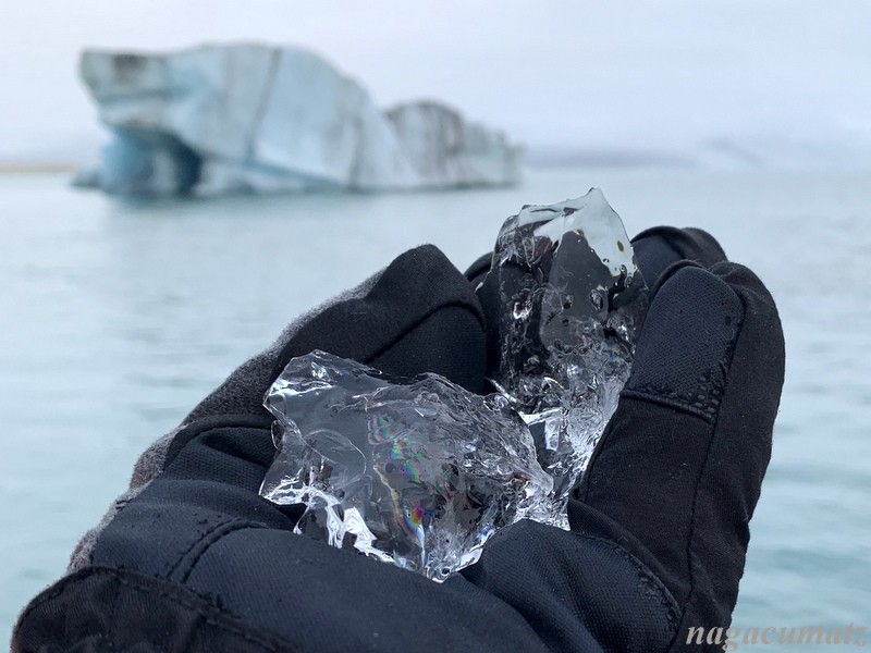 ただ、青だけならアルゼンチンのパタゴニアのエル・カラファテで見た氷河の方が黒い色が付いておらず綺麗だな(その様子は こちら )と思ったのだが、黒い筋は火山が爆発した時の火山灰と聞くと、アイスランドの氷山も又、歴史の証人のようで感慨深い。文字通り、見えているのは氷山の一角で、10~15%程度だけが水面に出ている。とても綺麗な青の氷は、持ち上げられて新しく出て来た部分。