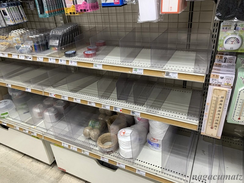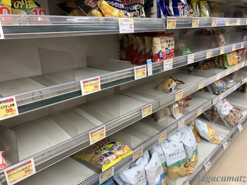 カップ麺やパン売り場はガラガラ。