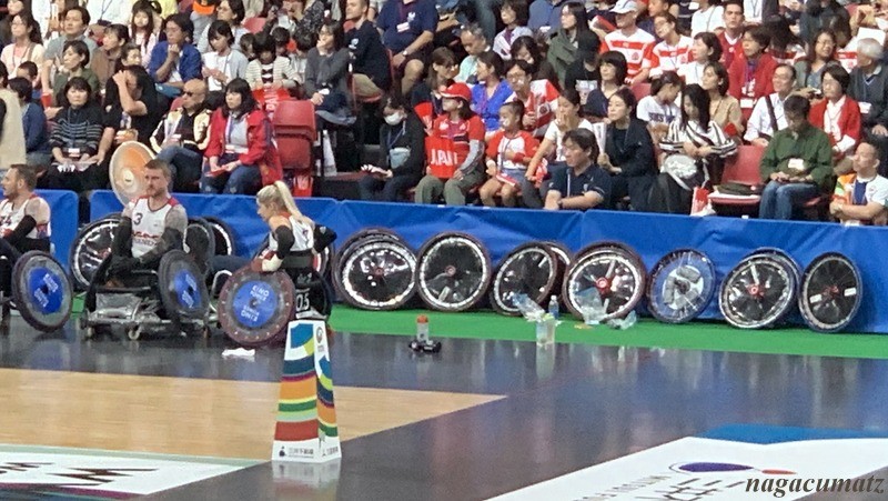 車椅子を使った競技で、唯一車椅子どおしを当てて(タックル)も良いルールなので、トライさせまいとガツン!と大きな音で当たる音が会場に響き、観客からは、うわー、と自然と声がもれる。