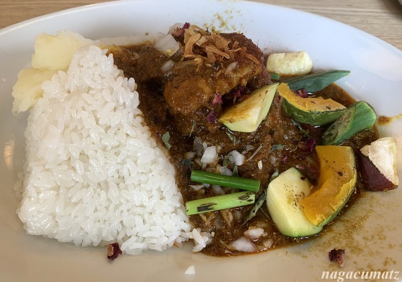 一人前でタマネギを約1個分使っているオリジナルカレー。美味しい。野菜は一度茹でてあるものをバーナーで焦がして風味を付けてある。