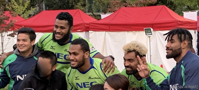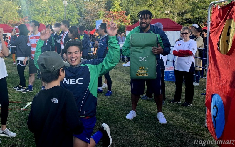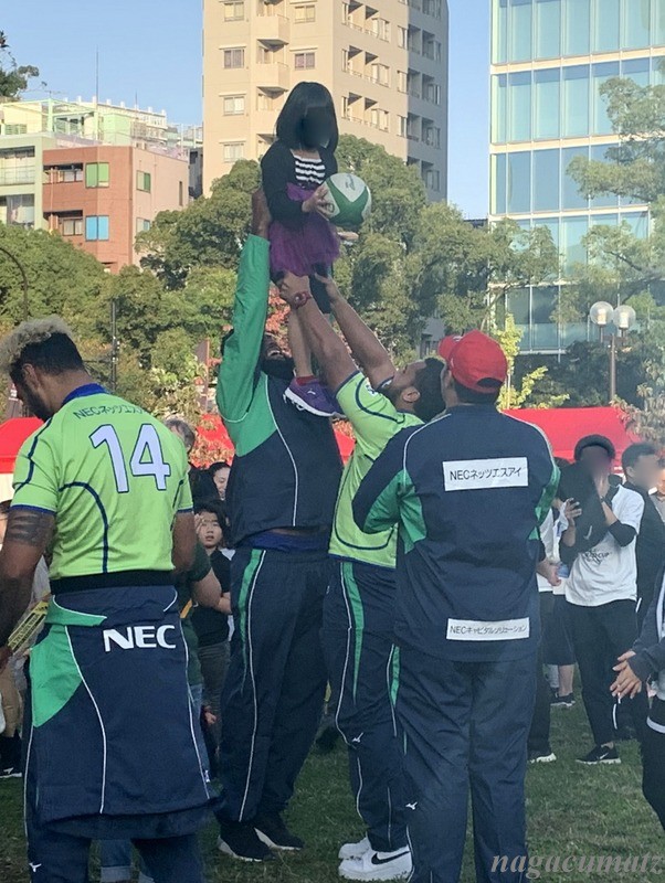 試合前には、NECのラグビーチームの選手達が、子供などと一緒に遊んでくれていたり、ヤグラ体験をさせてくれていたり。