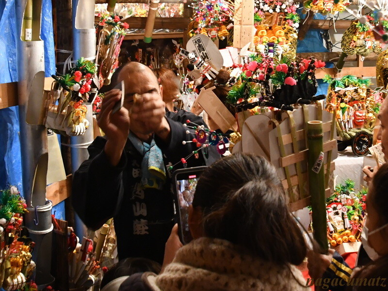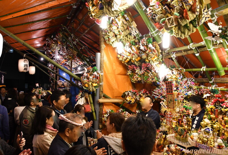 威勢の良い手締めがあっちのお店、こっちのお店で起こっているのだが、「ご祝儀いただきました!」との声も。ご祝儀???と思っていたのだが、熊手は熊手商と買った(勝った)、まけた(負けた)と気っ風の良いやり取りを楽しんで買うものとされ、商談が成立すると威勢よく手締めが打たれ、商品額をまけさせて、その差し引いた分を店側に「ご祝儀」として渡すのだそう。なるほど!