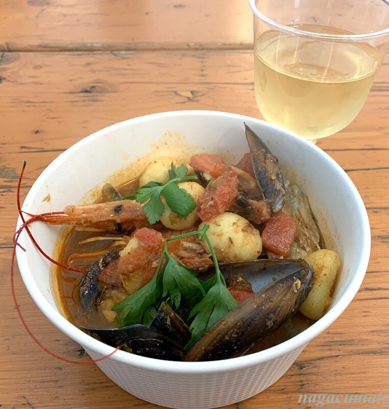 「CROSS TOKYO」の須賀利港の漁師風ブイヤベース 1200円。有頭海老が2尾、ムール貝や白身魚がごろごろ、ニョッキなども入っている。それに合うと言う辛口のシャルドネを。具沢山のブイヤベースはスープもとても良いお味で美味しい。