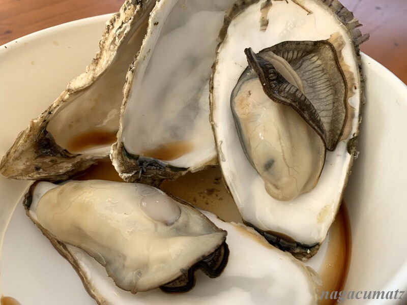 「ガンボ&オイスターバー」からの三陸産の蒸し牡蠣 2個 800円 ポン酢などをかけていただく。ぷっくりしていて美味しい。