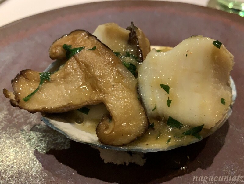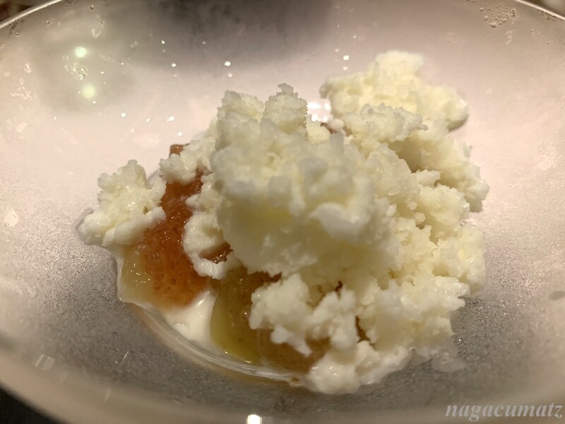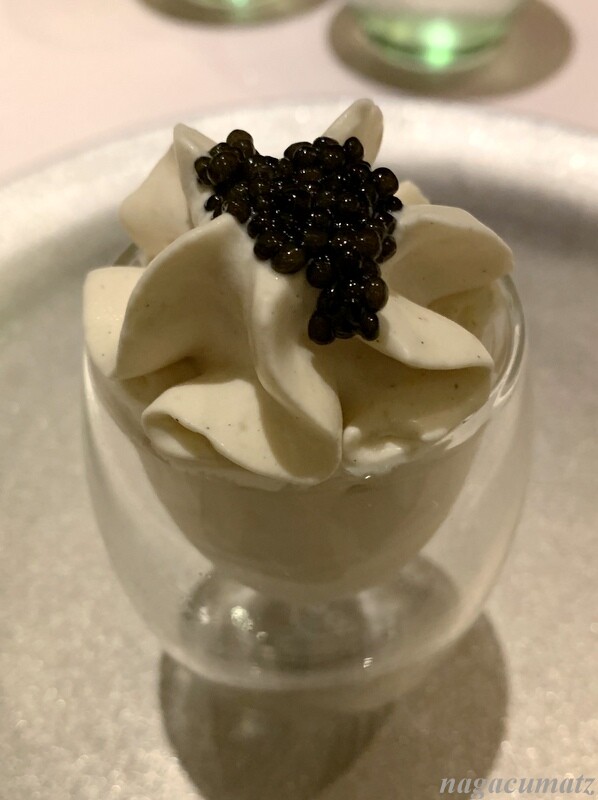 ”キャッツアイ”オイスターか、1000円追加してフレッシュキャビアのパフェとのことだったので、せっかくならとキャビアを。キャビアの下にはとても香ばしいほうじ茶のムース、その下には塩味の茹でたうずらの卵、その下にはお米料理とのことだが、まるで求肥。上から塩味・甘いお味・塩味・甘いお味と層になっている印象で美味しい。