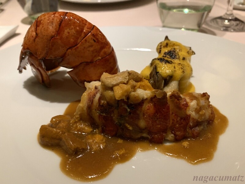 メインは、カナダ産オマールのロースト スパイス香味焼きか、オマールの雲丹のブイヤベース仕立てか、ニュージーランド産仔羊のグリル、希少黒毛和牛~阿蘇王~からの選択で、オマールの雲丹のブイヤベース仕立てを。付け合わせは舞茸など。オマールはさすがにプリプリしていて、雲丹のブイヤベース風のソースも美味しい。