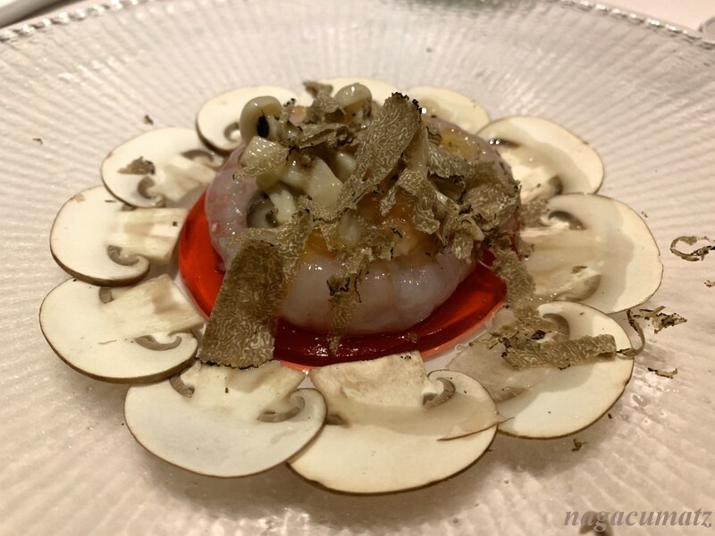 牡丹海老とマッシュルームのカルパッチョ。下には、ルバーブと何だったかな失念の赤いゼリー。上にはトリュフ。