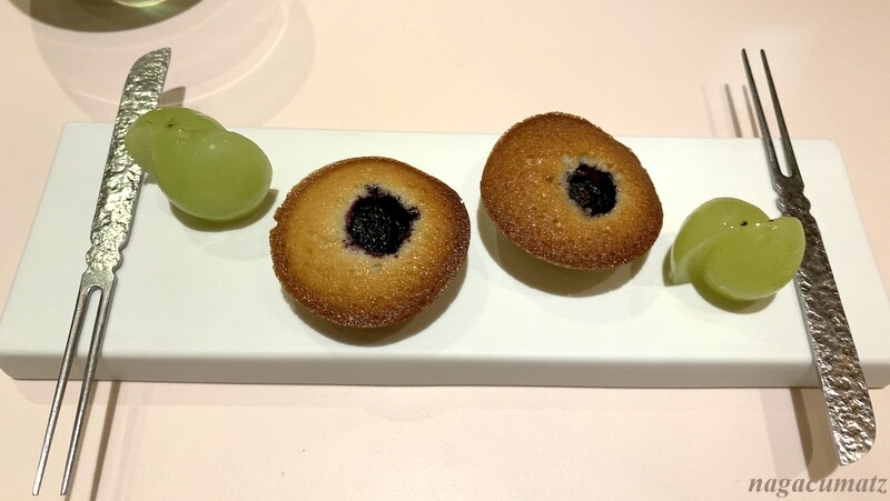 シャインマスカットとブルーベリーの入ったフィナンシェ。このフィナンシェは未だほんのり温かく、縁がカリッとした食感で美味。最後まで手を抜いておられないのが伝わってくる。