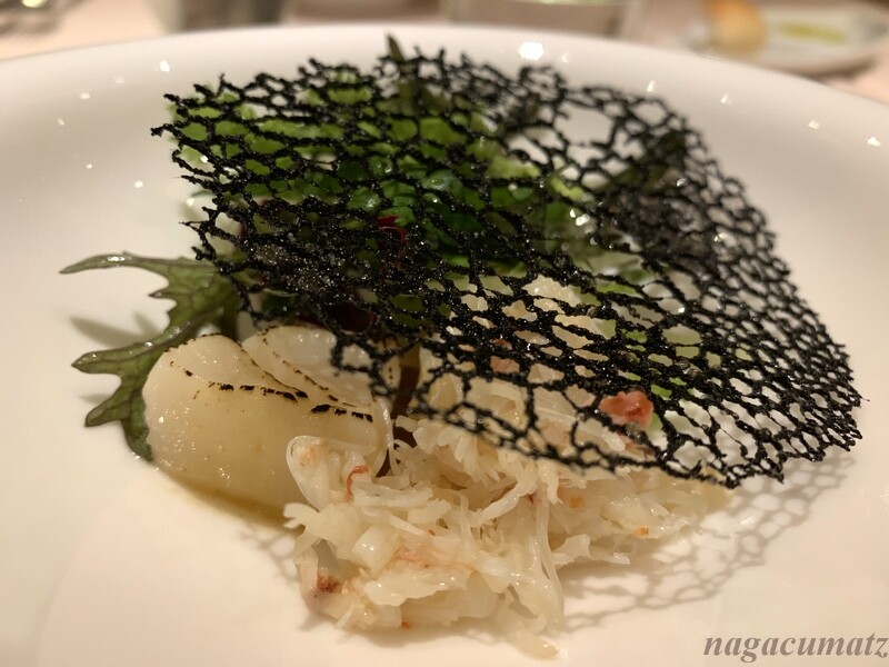 ズワイ蟹とホタテ貝をイカ墨のチュイルと。炙ったホタテがとても香ばしい。上のイカ墨のチュイルに結構塩味があるので、それを割りながら一緒にいただくとちょうど良い感じ。