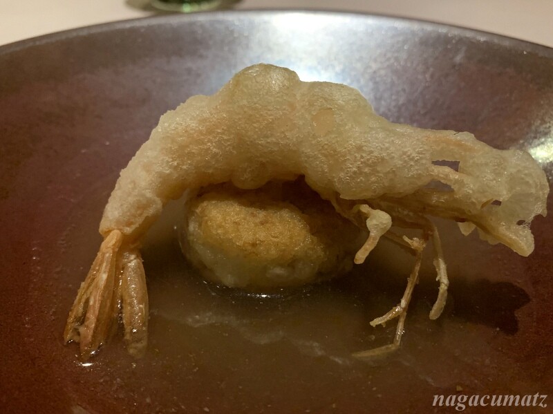 天使の海老の天茶仕立は、六穀米を使った小さな焼きおにぎりの上に海老の天婦羅が乗り、後から魚介のスープをかけてくださる。まるで和食な感じ。