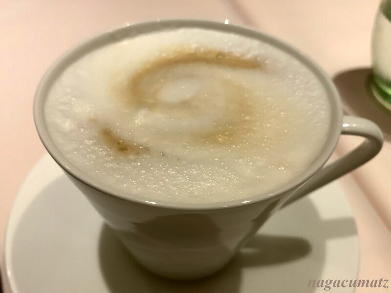 上には白いがコーヒー味(ホワイトブリューコーヒー?)、その下に皮を剥いたイチジク、下にはショウガのブランマンジェ。あっさり&すっきりとお料理の後には良い感じ。カプチーノ