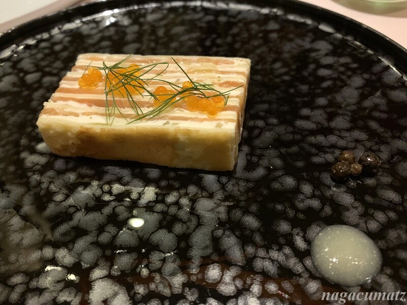 タスマニア島サーモンといくらのミルクレープ。いくらとあったが鱒子かな。横に、レモン風味のソースと、塩生胡椒がつく。ミルクレープ自身が美味しいのだが、こってりしているので、レモンの酸味や、胡椒の塩分でキリリと引き締まる。ディルとも合う。
