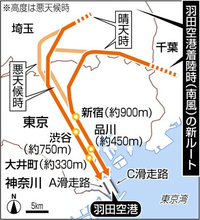このルートが実際に活用される3月29日からは、午後3時~7時に2~4分おきに国際線が着陸することになると! (このルートマップは東京新聞から)