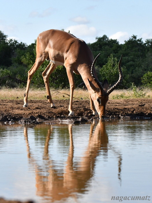 勿論、ゾウだけではない。カメ、インパラ、マングースなども。このオスのインパラは珍しいことに、たった一頭でやって来た。通常は危険を察知する為にも、群れで行動しているので、群れから追い出されてしまったのかも? また、干ばつの時などは、草が生えていない為に限られた水だけを飲むことになり、足が弱ってハイエナなどに襲われたりもするのだそう。